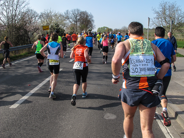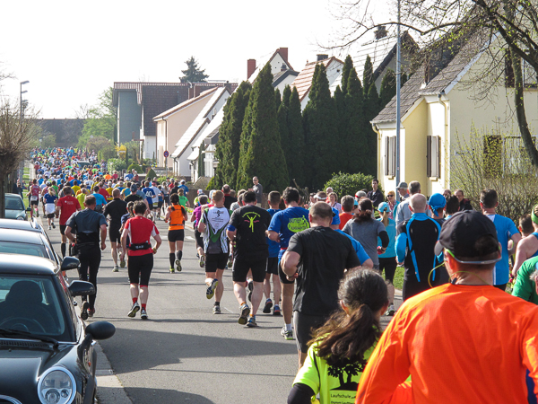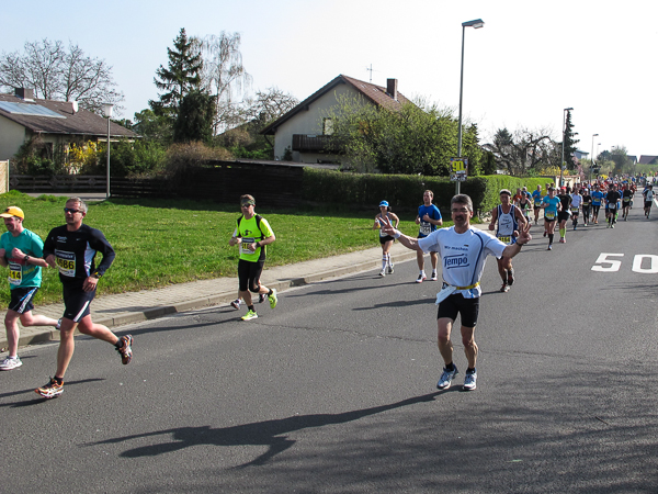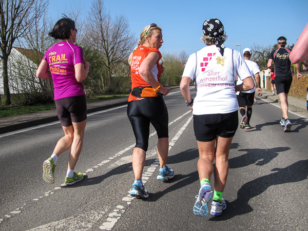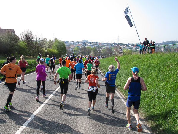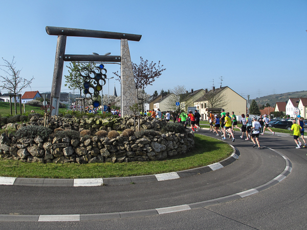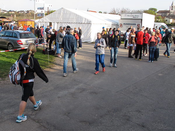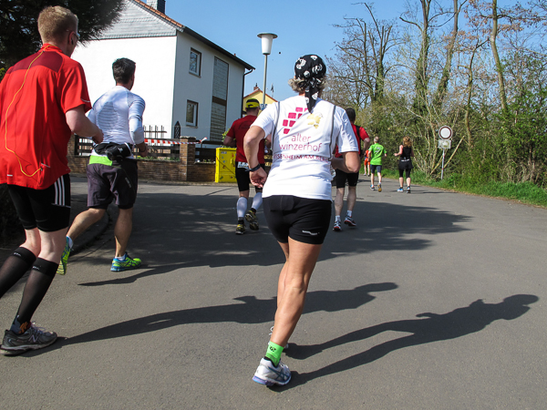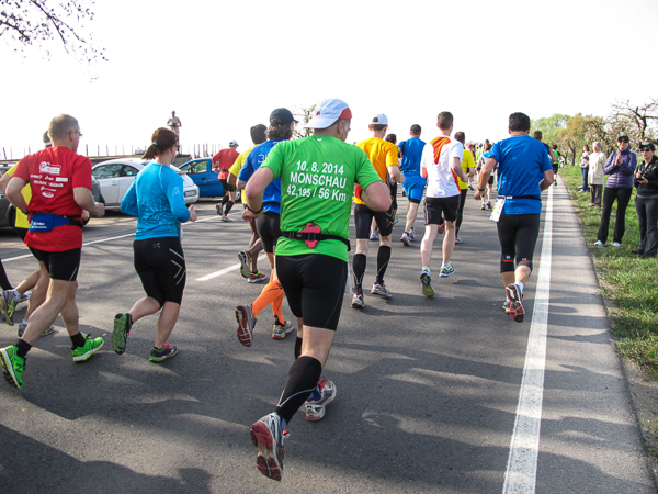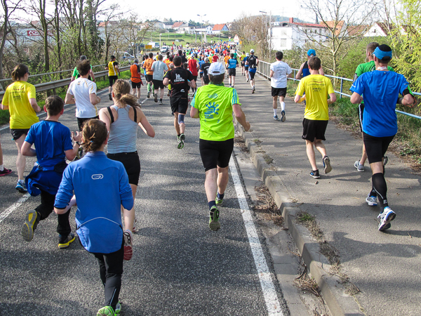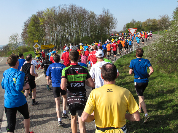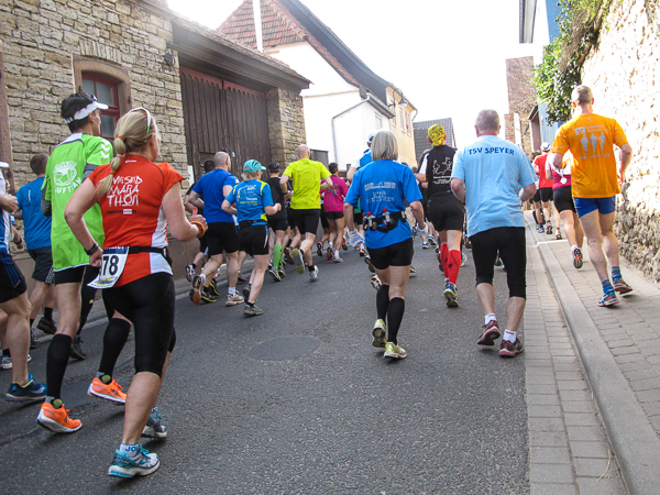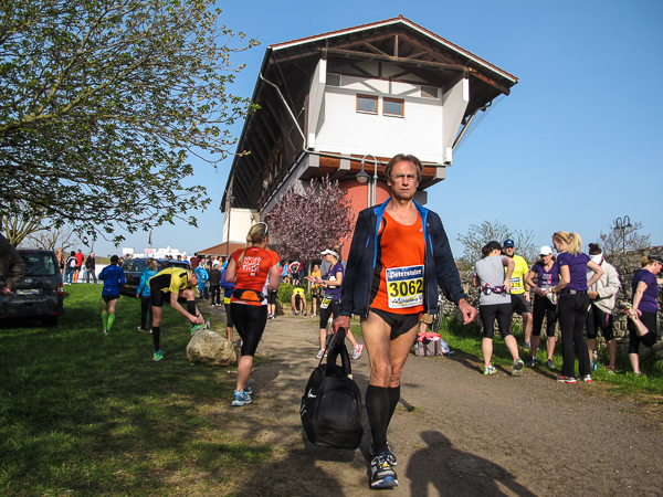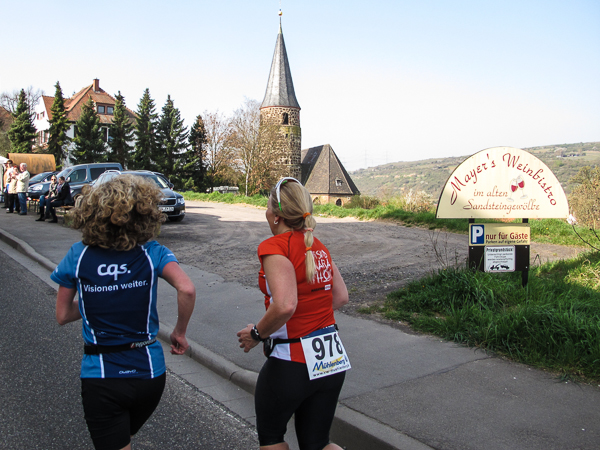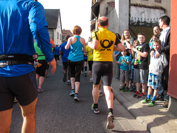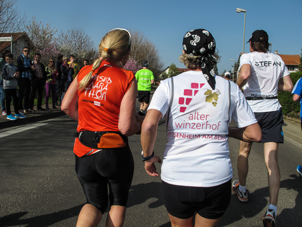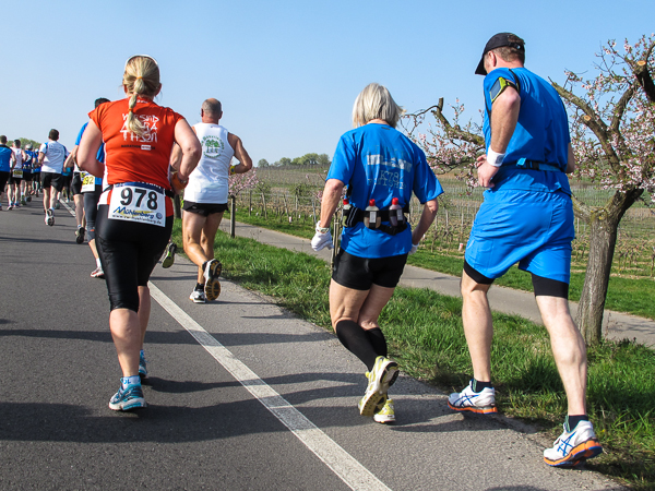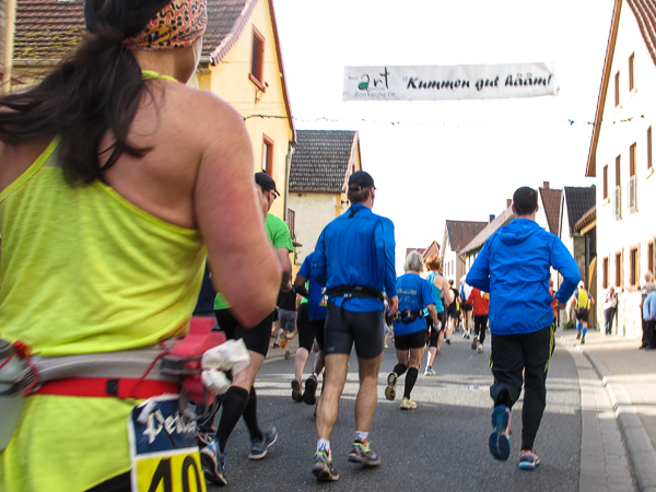 Wo sonst traubenbehangene Weinberge sind, laufen farbige Läuferpunkte entlang der knorrigen, noch splitternackten Rebknorze, die zu tausenden schnurgerade in Reih‘ und Glied stehen. Zwischen den Reihen sprießt frisches, junges Gras. Die vielen Feldwege sind kurvenfrei und meist asphaltiert, Bäume und Hecken sind dagegen Mangelware. „Isch kumm aus dä Palz“, tönt ein kommunikationsfreudiger Läufer und gesellt sich zu mir. Seine Offenheit ist entwaffnend. Die Pfälzer Frohnatur fühlt sich sichtlich wohl. „Un wi ald bischd´n du?“, und deutet gleichzeitig auf ein Schild mit einer kleinbeerigen, schwarzen Traube auf gelben Grund.