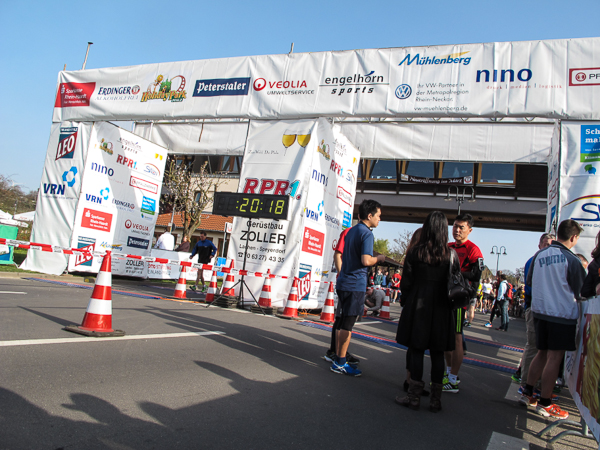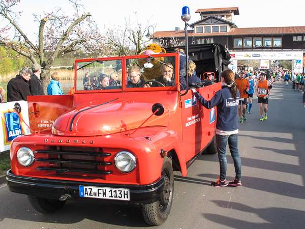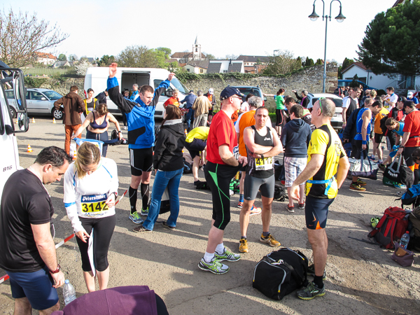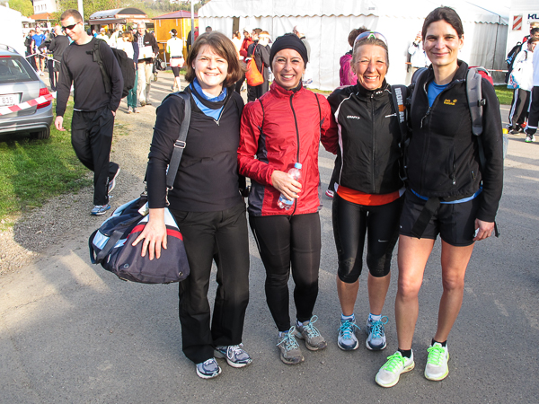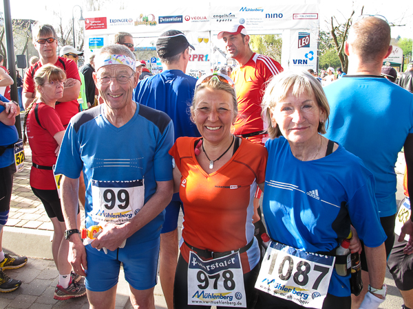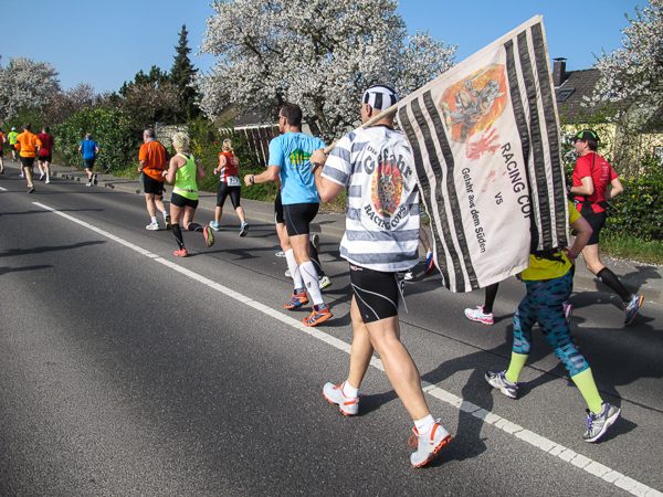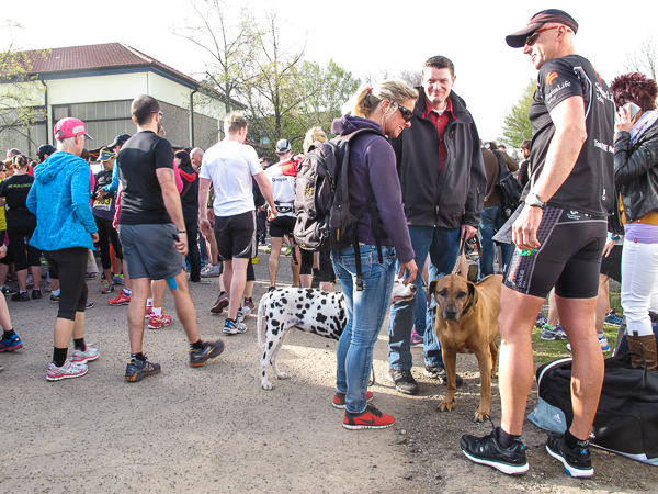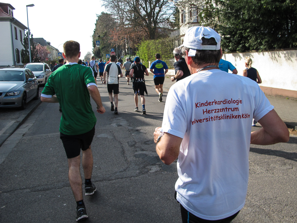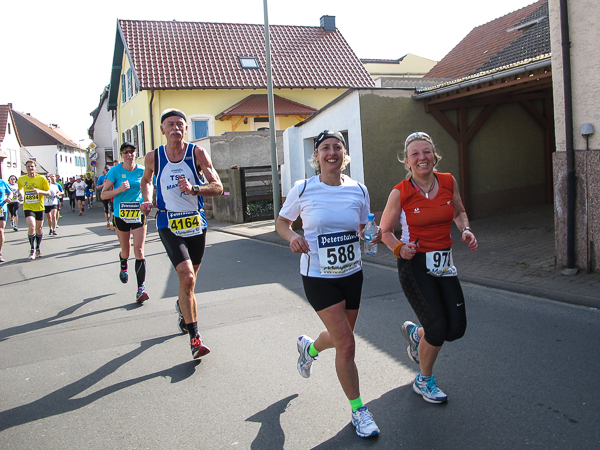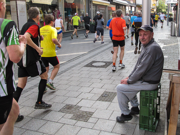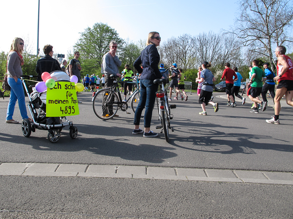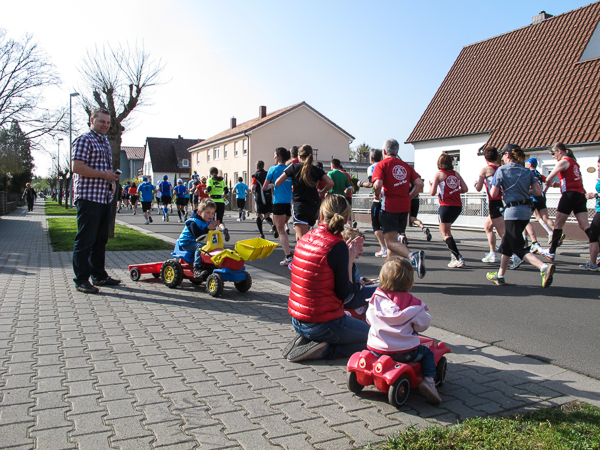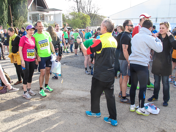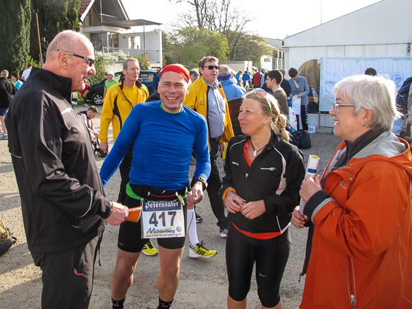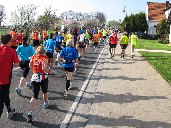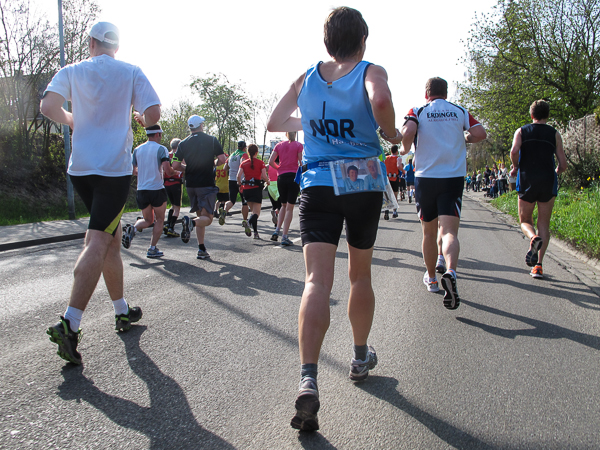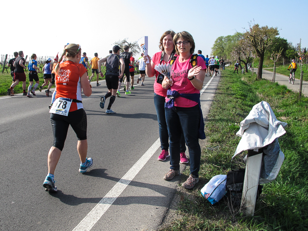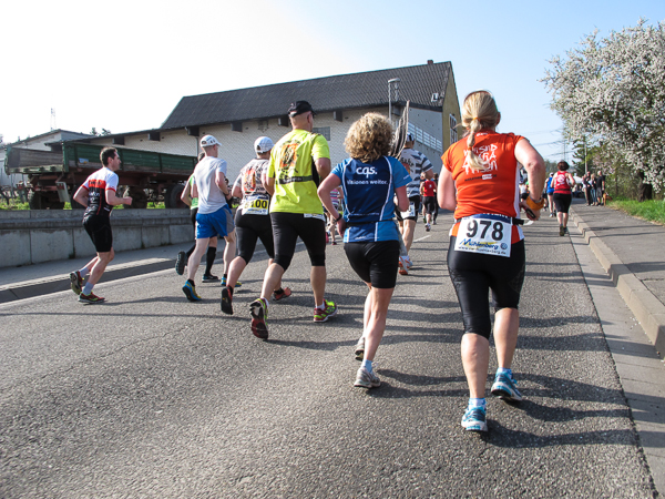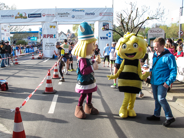 Wo sonst traubenbehangene Weinberge sind, laufen farbige Läuferpunkte entlang der knorrigen, noch splitternackten Rebknorze, die zu tausenden schnurgerade in Reih‘ und Glied stehen. Zwischen den Reihen sprießt frisches, junges Gras. Die vielen Feldwege sind kurvenfrei und meist asphaltiert, Bäume und Hecken sind dagegen Mangelware. „Isch kumm aus dä Palz“, tönt ein kommunikationsfreudiger Läufer und gesellt sich zu mir. Seine Offenheit ist entwaffnend. Die Pfälzer Frohnatur fühlt sich sichtlich wohl. „Un wi ald bischd´n du?“, und deutet gleichzeitig auf ein Schild mit einer kleinbeerigen, schwarzen Traube auf gelben Grund.