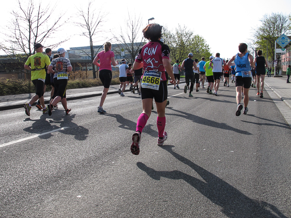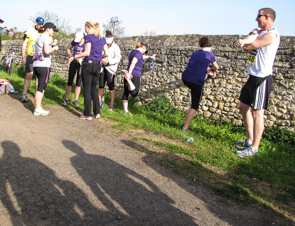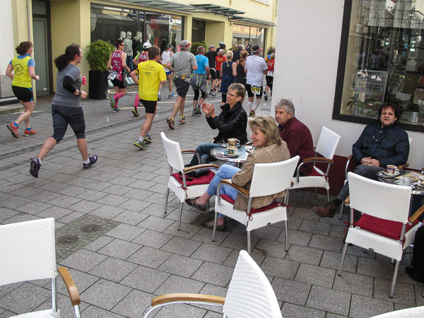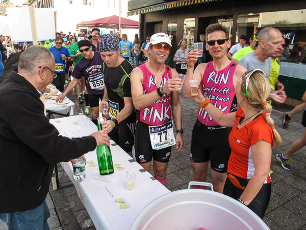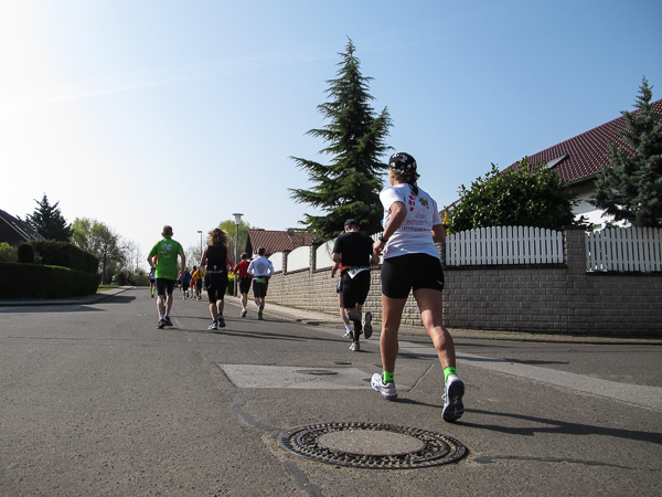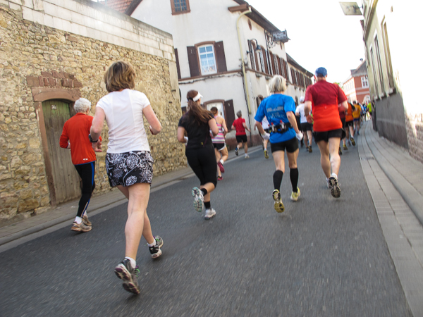 Ein fast perfekter Lauf, abgesehen von Begleiterscheinungen, die diese ungewöhnlichen elf Trinkpausen mit sich bringen (können). Nicht nur die Wirkung des spritzigen, leichten Getränks lässt mich entspannt und rosarot auf die noch vor mir liegenden Kilometer schauen. Gleichmäßig unrhythmisch sind meine Schritte. Ich schlurfe mich in Trance und liefere mir dabei Zweikämpfe mit Weinbergschnecken und rosaroten Panthern. Nicht umsonst sagt man, Wein sei ein idealer Begleiter.