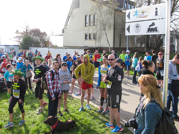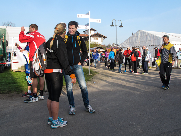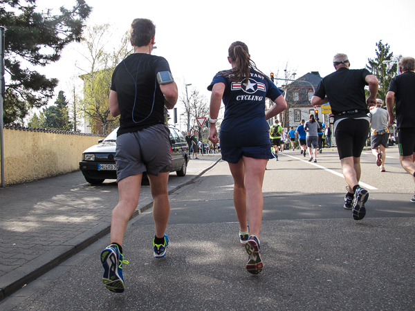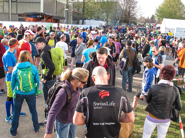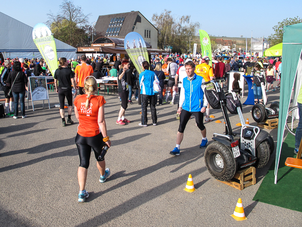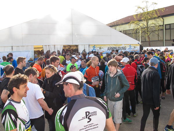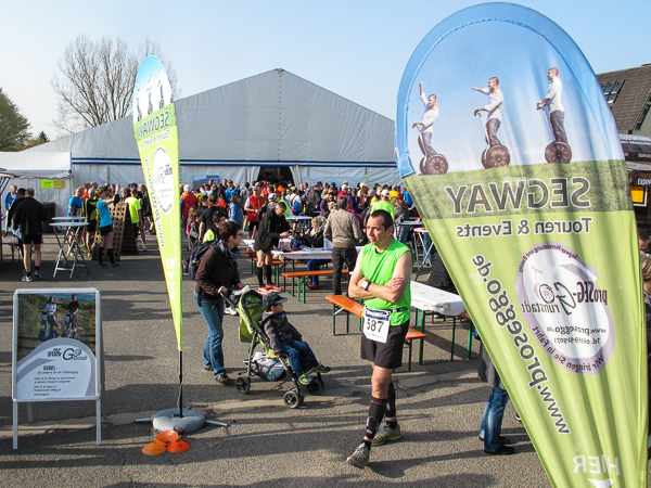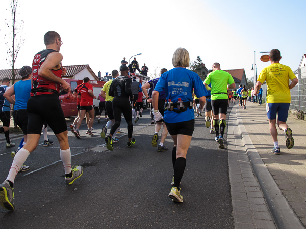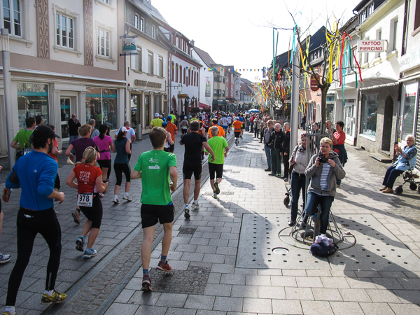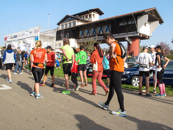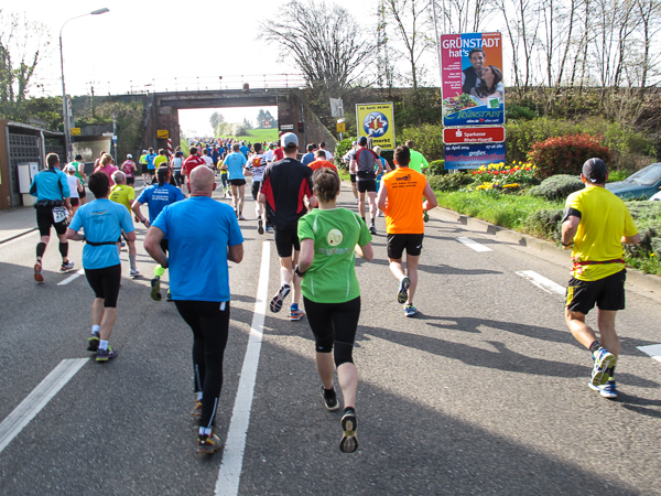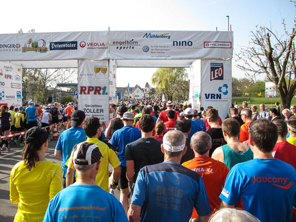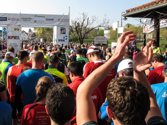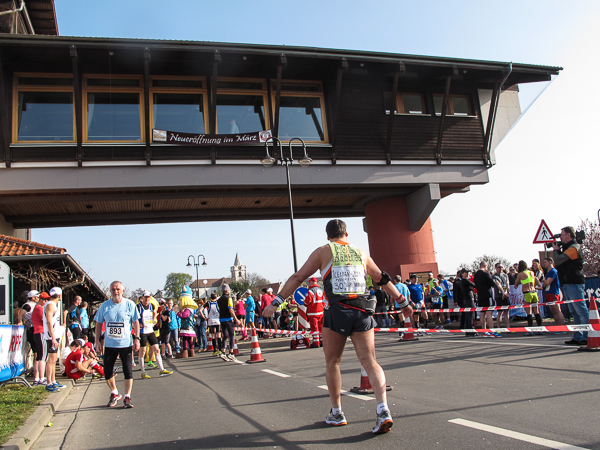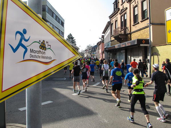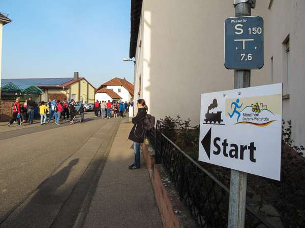 Ist es zehn, oder vielleicht doch erst neun Uhr? Die gestrige Reise und die unsensible Zeitumstellung stecken mir in den Knochen. Für Stimmung am Startplatz um das Haus der Deutschen Weinstraße sorgt ein Song der Höhner: „Wenn nicht jetzt wann dann? Wenn nicht hier, sag mir wo und wann. Wenn nicht du, wer sonst.“ Das haben sich die 2.931 Starter bei der Anmeldung wohl auch gedacht. Dichtgedrängt laufe ich durch das Haus der Deutschen Weinstraße, welches brückenartig die Weinstraße überspannt. Es geht auf der B 271 Richtung Süden. „Kummen gut hääm!“ steht auf einem über die Straße gespannten Plakat.