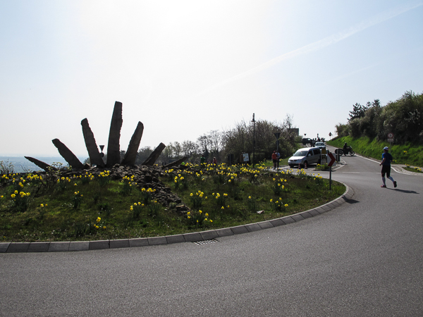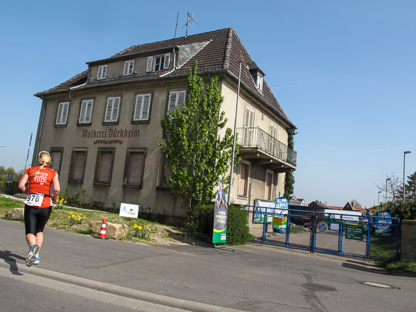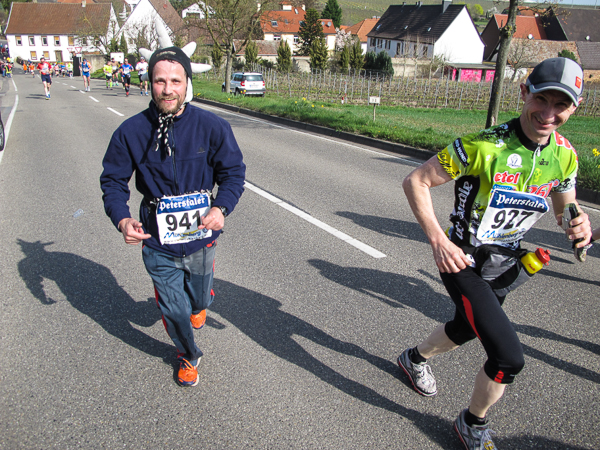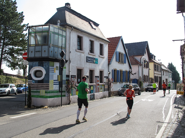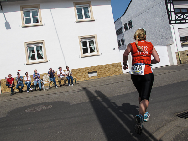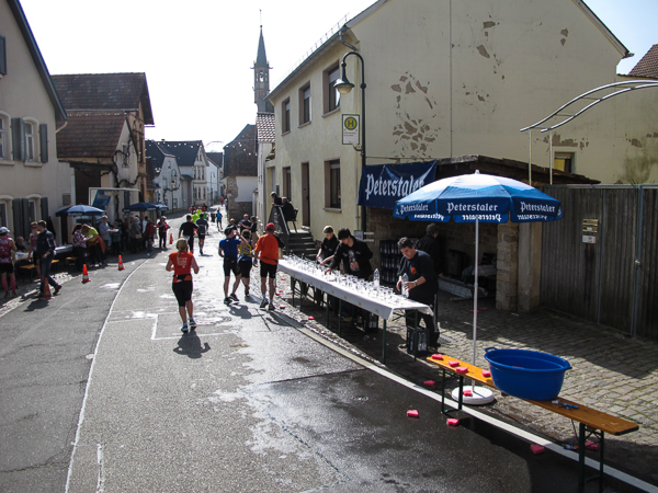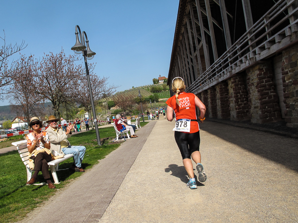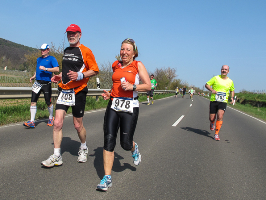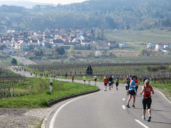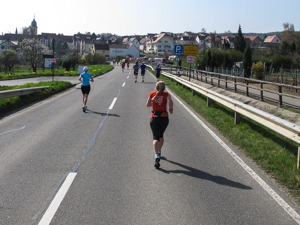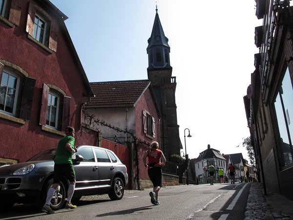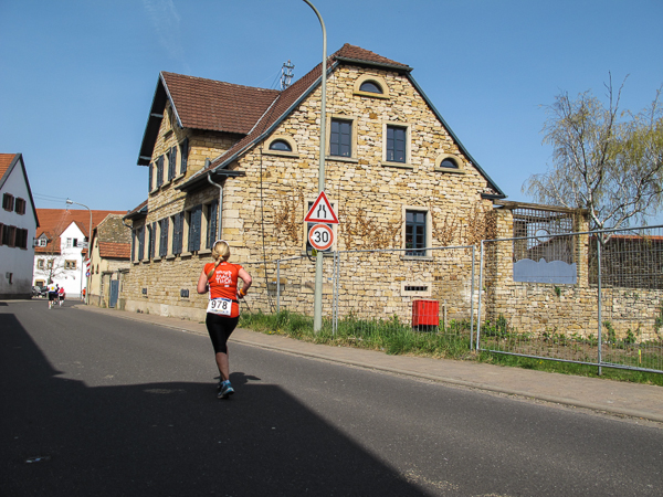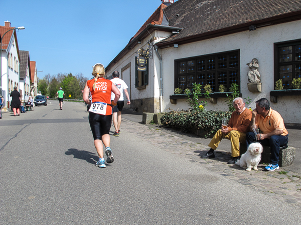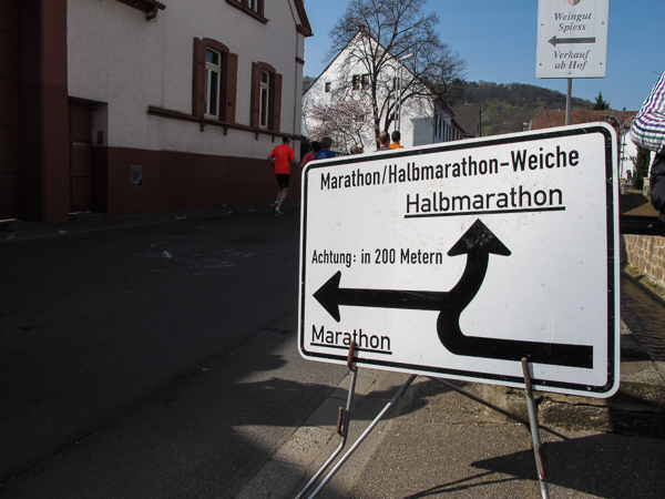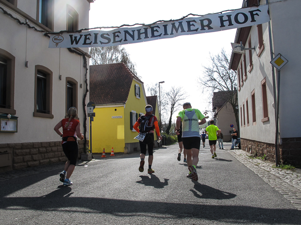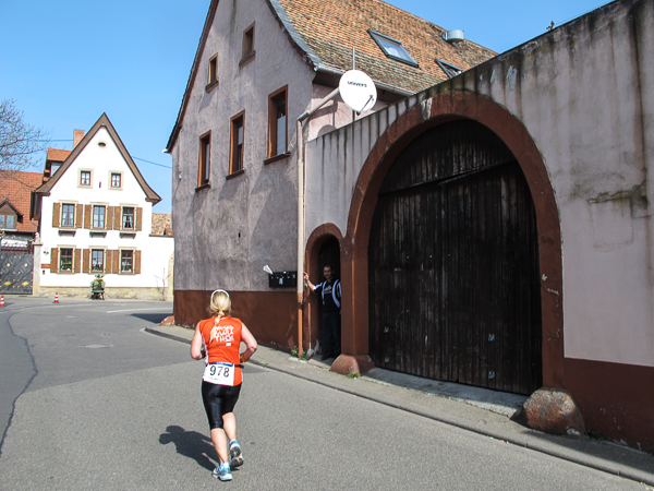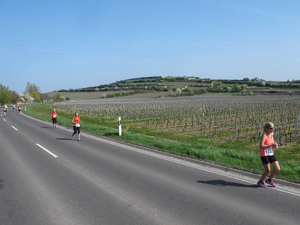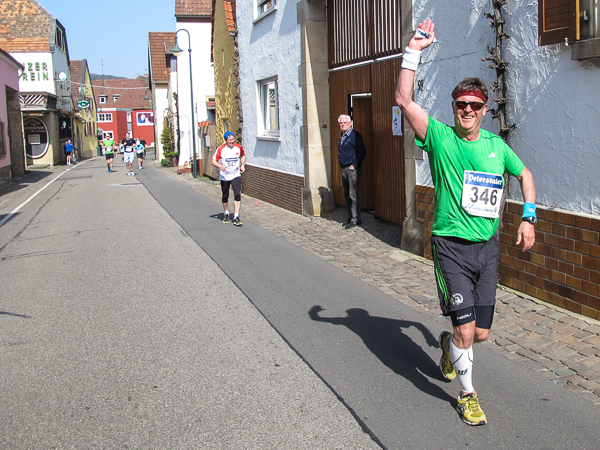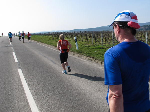 Die ersten zehn lustigen und hügeligen Kilometer liegen hinter mir, als ich durch das kleine Dorf der Mühlen und Brunnen, Kleinkarlbach, laufe. Hier trennen sich die Wege der Marathon-/ und Halbmarathonläufer und ich freue mich über mehr Bewegungsfreiheit bei schwankendem Gang. Etwas weiter schützen die Ausläufer des Haardtgebirges die WeinBERGE. Um mich herum höre ich es keuchen und schnaufen, der erste große Anstieg nach Bobenheim am Berg. Für einige bereits eine Bewährungsprobe. Weit geht der Blick über das Pfälzer Land, ich sehe die rauchenden Schlote im zwanzig Kilometer entfernten Ludwigshafen. Wenn, wie Naturpsychologen herausgefunden haben wollen, allein der Anblick einer sanft geschwungenen, hügeligen Landschaft Glücksgefühle auslöst, kann auch der Veranstalter mehr als zufrieden sein. Am höchsten Punkt der Marathonstrecke strahlen die schwitzenden Läufer über das ganze Gesicht. Die Pfälzer Frohnatur klopft mir auf die Schulter. „Alla hopp, lass unsch do käh Wurzle schloche“. Wir begeben uns wieder auf die Strecke.