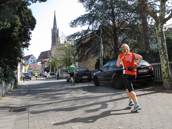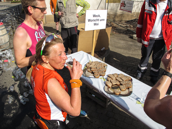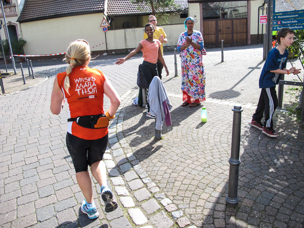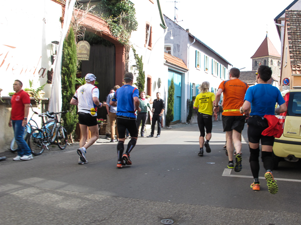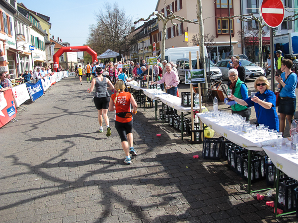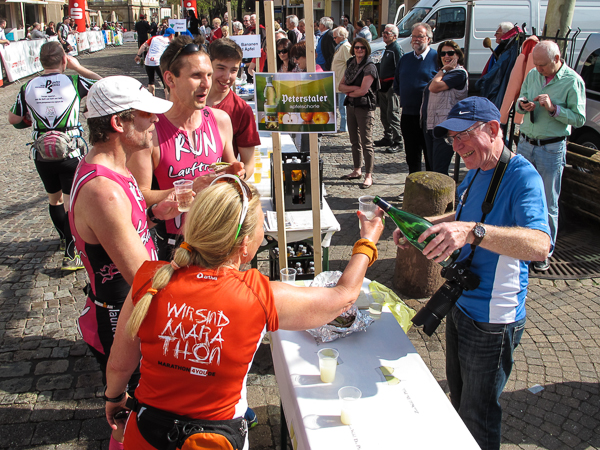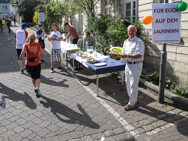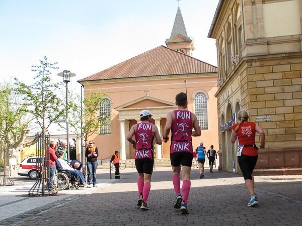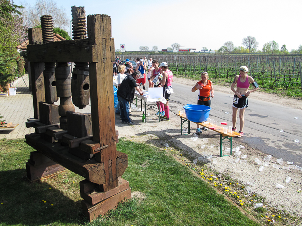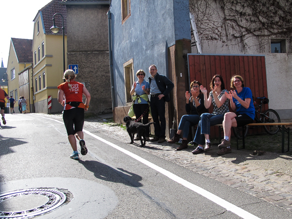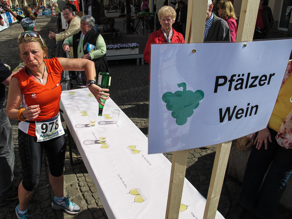 Mitten auf dem Stadtplatz/Römerplatz, sozusagen im Mittelpunkt des Marathons, prosten mir die Panther von weitem zu. Auf der ganzen Strecke schwärmten sie schon von dem Lewwerworschtbrot von Rainer vom LC Bad Dürkheim, der mich überschwänglich begrüßt. Die rosaroten Panther wirken angeschlagen, der Wein ist leer. Unter der Live-Moderation durch Henning, ebenfalls vom LC Bad Dürkheim, laufe ich dann aber auch endlich weiter, denn noch zwanzig nicht zu unterschätzende Kilometer liegen noch vor mir.