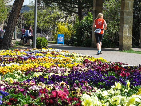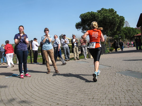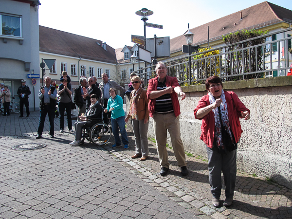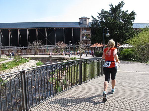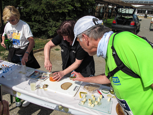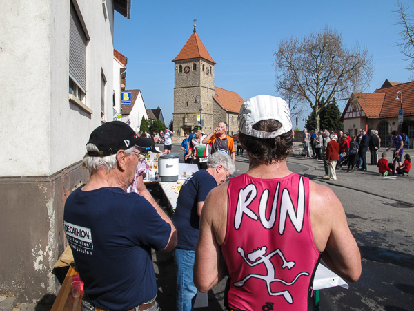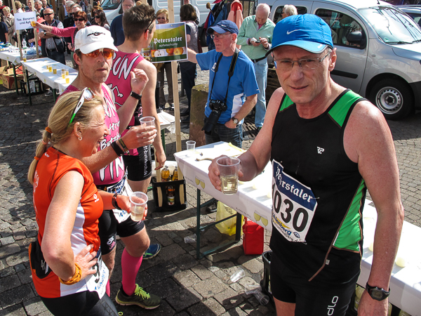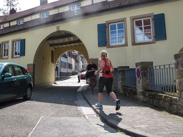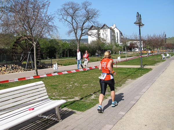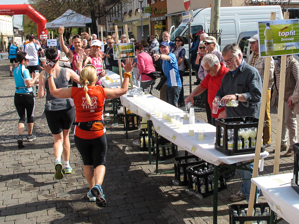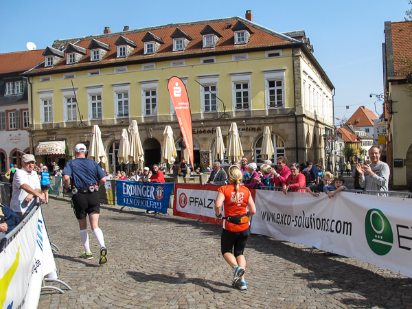 Mitten auf dem Stadtplatz/Römerplatz, sozusagen im Mittelpunkt des Marathons, prosten mir die Panther von weitem zu. Auf der ganzen Strecke schwärmten sie schon von dem Lewwerworschtbrot von Rainer vom LC Bad Dürkheim, der mich überschwänglich begrüßt. Die rosaroten Panther wirken angeschlagen, der Wein ist leer. Unter der Live-Moderation durch Henning, ebenfalls vom LC Bad Dürkheim, laufe ich dann aber auch endlich weiter, denn noch zwanzig nicht zu unterschätzende Kilometer liegen noch vor mir.