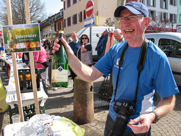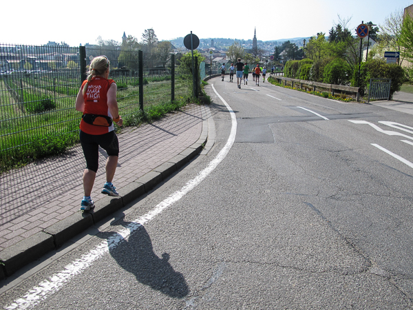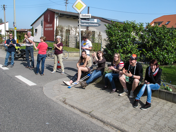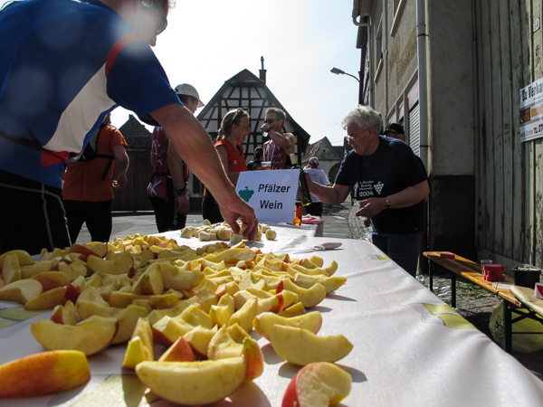 Zwischen Glas und Lewwerworschtbrot müssen Erinnerungsfotos gemacht und sofort auf Facebook gepostet werden. Wie von selbst laufen die Beine abwärts in den Edelweinort Leistadt mit dem barocken Rathaus. Am anderen Ende des Rathausplatzes sitzt unterdessen eine große Gruppe beim FC Leistadt und gönnt sich ein Weißwurst-Frühstück. Nach einem kurzen Anstieg rollt es weiter abwärts und es sind noch knapp drei Kilometer bis nach Bad Dürkheim.