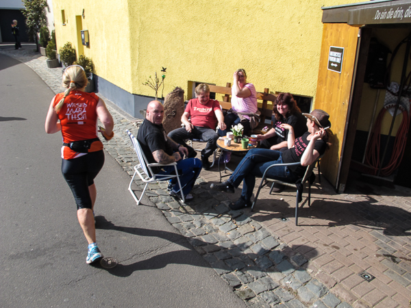 Bei Weck, Worscht unn Woi treffe ich auf zwei Kerle im figurbetonten, rosafarbenen Einteiler. Schnell wird mir klar, die kommen wie ich aus Hessen und sind erfahrene Weinstraßen Marathon-Läufer.