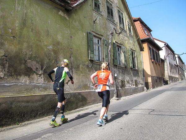 "Runter schmeckt's bekanntlich besser als rauf". Die zwei Panther eilen hastig an mir vorbei, wollen möglichst schnell die nächste Verpflegung erreichen. Mit Renate und Ludwig laufe ich ein Stück gemeinsam durch Weisrem (Weisenheim am Berg). Und tatsächlich, am nächsten Weinstand gable ich die beiden rosa Raubtiere wieder auf. Nicht nur hier sind alle fröhlich, haben ein Lächeln im Gesicht. „Das macht richtig Spaß“, sagt eine Läuferin berauscht neben mir. Obwohl Weine eine große Ruhe und Gelassenheit ausstrahlen sollen, wird es nun in unserer Verkostungsgruppe doch ganz schön hektisch.