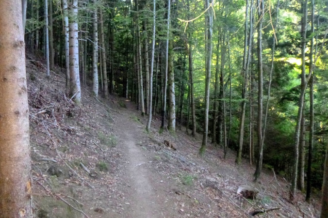 Eine Zeitmessung, eine Straßenquerung, dann beginnt ein 500 m Abstieg. Wunderbare, steile Trails in schattigem Wald, ohne Fallen. Man könnte es so richtig rollen lassen. Aber die Serpentinen haben es in sich, aufpassen muss man schon. Zur Markierung sind große, gelbe Schilder aufgestellt, es gibt gar keine Zweifel über die Streckenführung. Auch der Abzweig der kürzeren Strecken ist deutlich markiert.