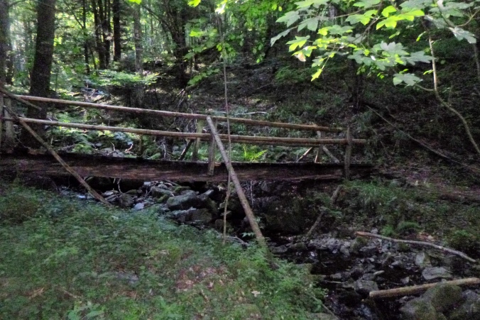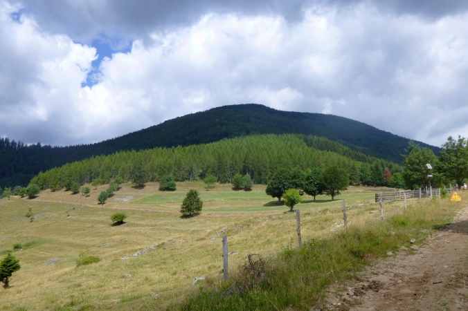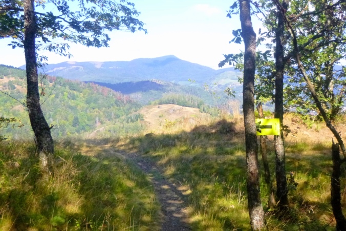 Ab hier wechseln wir die Talseite. Etwa 400 HM am Stück wollen gemeistert werden. Auf sausteilen, verwilderten, ausgewaschenen Wegen und schmalen Trails geht es langsam aufwärts. Am Ende wartet eine schöne Forststraße mit Schutzhütte, Ruhebänken und einer Wahnsinnsaussicht nach Westen rüber in den Belchen-Naturpark hinein. Ganz großes Kino. Sage und schreibe 6 Wege gehen von hier weg. Natürlich gerate ich, wie manche andere auch, erstmal auf den falschen. Bis wir das merken, haben wir bereits 50 HM abgebaut. Also wieder hoch, auf den richtigen Pfad eingebogen, und mit Tempo wieder runter. Warm ist es, aber wir bewegen uns im Schatten bis Moosch, nach 31 km unser letzter Stützpunkt.