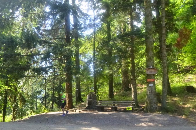 Über die Hauptstraße und Bahnlinie erreichen wir den Wald. Ohne Übergang fängt der Anstieg an und hört erst nach 10 km auf. Die meiste Zeit sind wir im Schatten. Etwa auf halber Höhe gibt es einen kleinen Brunnen, ein Labsal. Breite Forststraßen bieten keine Probleme, sauber aufgeschichtetes Brennholz säumt den Weg. An einem großen Holzverladeplatz geht es auf Trails weiter aufwärts. Der Gipfel mit der Kuppel scheint zum Greifen nah. Ab dem Col de Haag wird es tatsächlich etwas flach. Es ist noch 1 guter km bis ins Ziel. Die Auberge lockt mit Isotonischem. Hat der Akku wieder Power, läuft es sich plötzlich ganz leicht. Vergessen ist der Teufelsanstieg.