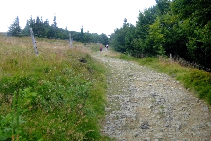 Nach 9 km ist VP1 an der Auberge du Steinlebach angesetzt. Hunger und Durst sind schnell gestillt. Hier sind übrigens später auch die Duschmöglichkeiten zu finden. Noch etwa 2 km weiter und schön aufwärts sind wir an den Parkplätzen auf 1200 m. Weiter führt der Trail über kleine Gipfel mit prächtiger Aussicht. Zum ersten Mal ist der Grand Ballon zu sehen. Weit, sehr weit ist es noch…