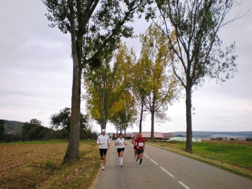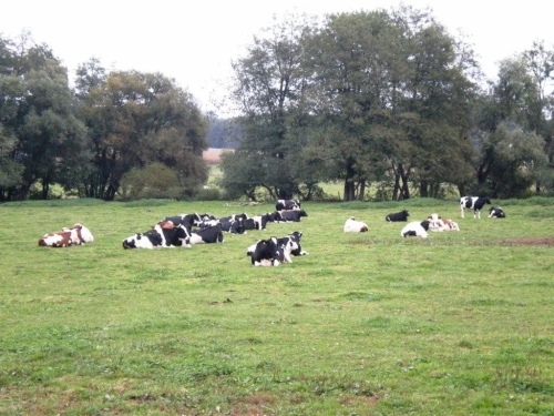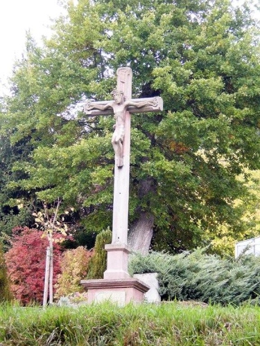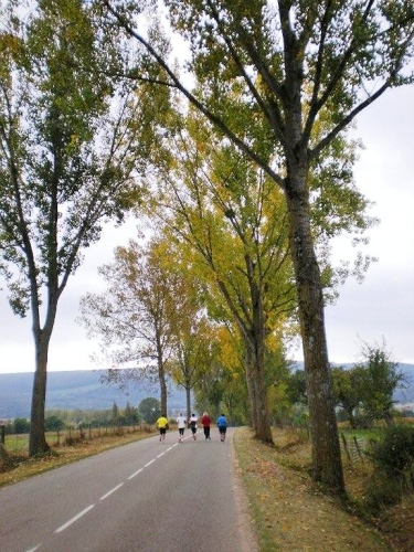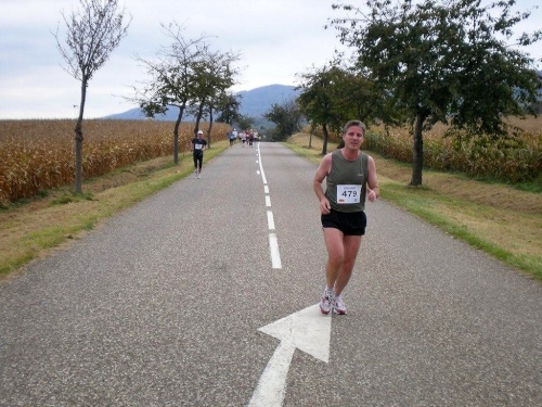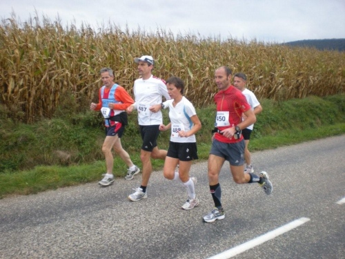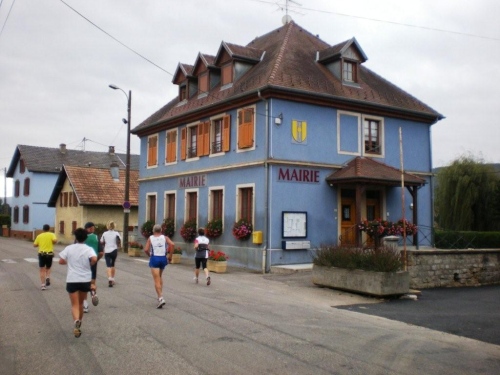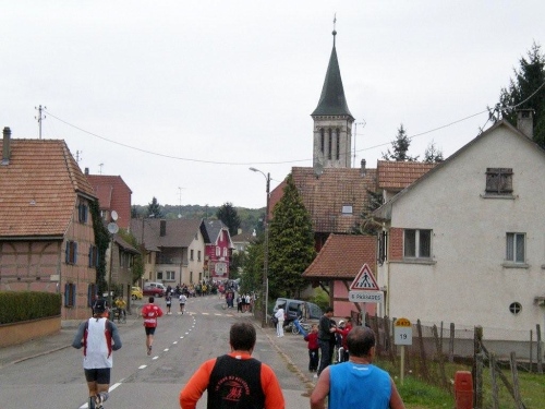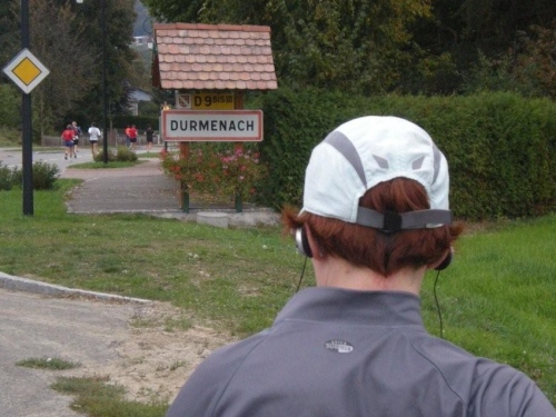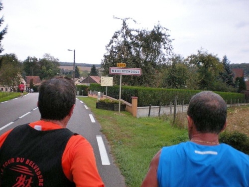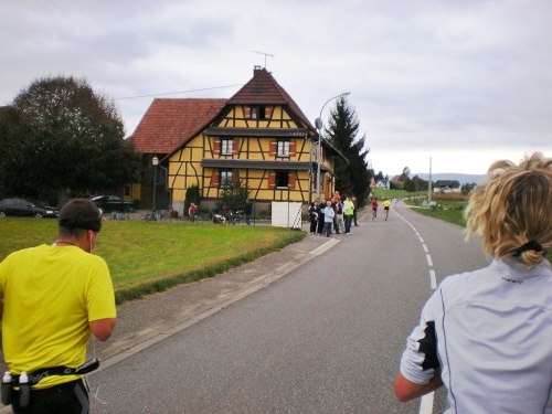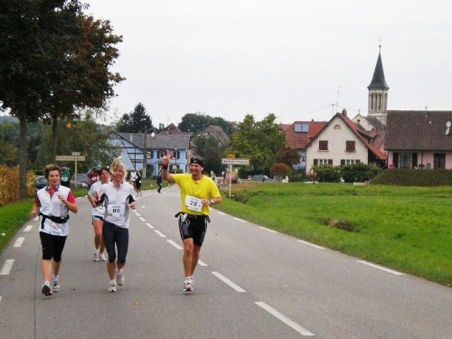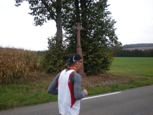 Die Dörfer im Sundgau sind nicht groß, und so dauert es nicht lange, bis wir wieder in der Landschaft draußen sind. Vorbei an friedlich ruhenden Kühen und Maisfeldern geht es leicht wellig nach Bouxwiller, wo nach etwa acht Kilometern die Strecke der Ferrettoise rechts abzweigt und die Marathonisti am Rand des Dorfes über die „route départementale“, an einem weiteren Wegkreuz vorbei, nach Werentzhouse geleitet werden. Ein Fahrradfahrer gesellt sich neben die Dreiergruppe, mit welcher ich schon eine Weile unterwegs bin, und gibt eine Positionsmeldung weiter. Der zufolge ist sind die Damen an siebter, achter Stelle und ich müsste gemäß dieser Zählung den hundertsten Zwischenrang belegen.