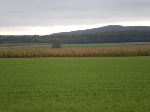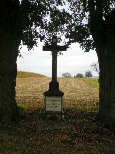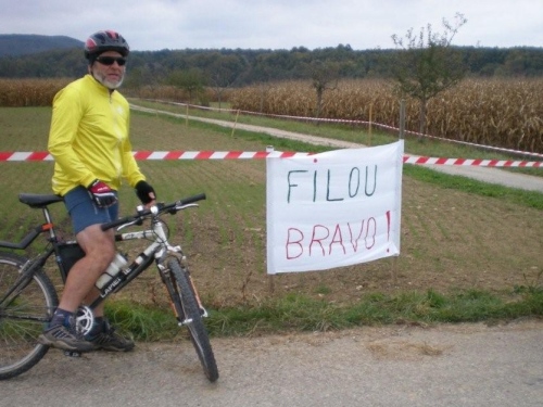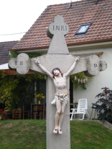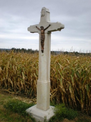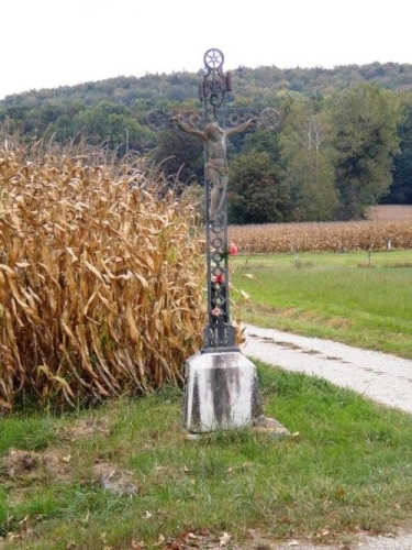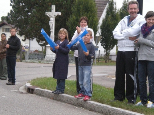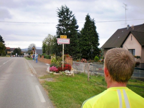 Der Wind ist im Rücken und ich nehme ihn nur wahr, weil er die Maisfelder neben der Straße dauernd am Rascheln hält. Nächste Station ist Fislis. So klein der Flecken auch ist, die Zuschauer sind mit Begeisterung an der Strecke, wie wenn die Weltelite vorbeikäme. Nach dem lebhaften Teil am Dorfrand kommt wieder die Ruhe der Landschaft. Still steht das nächste Wegkreuz vor dem Maisfeld, durch welches der Wind streicht. Am östlichen Horizont ist es hell, so wie es am frühen Morgen schon war. Ob sich der bedeckte Himmel über dem Sundgau noch freundlicher zeigen wird?