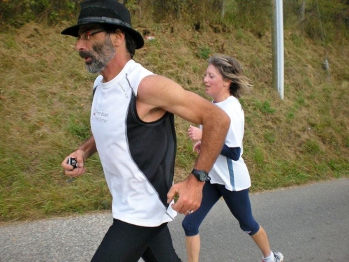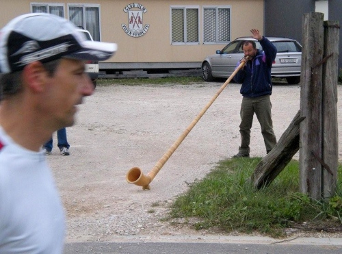 Das Verkehrsschild mit einem Flugzeug und dem schriftlichen Zusatz ULM deutet nicht etwa an, dass es von hier eine Flugverbindung in die Stadt des Einstein-Marathons gibt. Es ist die Abkürzung für ultra-léger motorisé, also motorisierte Ultraleichtflugzeuge, die parallel zur Straße ihre Graspiste haben. Über dem Gelände ist kein Motorenlärm zu hören, das Einzige, was uns entgegenschwebt, ist der Klang eines Alphorns, mit welchem den Läufern die Aufwartung gemacht wird.