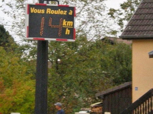 Auf die Bedürfnisse der Marathonis zugeschnittene Verpflegung gibt es gleich im nächsten Dorf, in Durmenach. Zum Beginnen Wasser, Bananen und Orangen. Auf dem Weg dorthin werden wir schon eingangs Ortschaft begeistert empfangen. Vor dem ersten Kreuz, das mir am Wegrand begegnet, stehen Alt und Jung. Besondere Beachtung finden die einheimischen Teilnehmer. Man kennt sich hier. Man weiß auch, dass die Verlockung groß ist, bei der Einfahrt in die Dörfer die Geschwindigkeit nicht den Vorschriften und den Gegebenheiten anzupassen. Deswegen steht eine Geschwindigkeitsmessanlage am Straßenrand, die auch mir andeutet, dass mein kurzer Zwischenspurt nach einem Fotostopp zu schnell geraten ist.