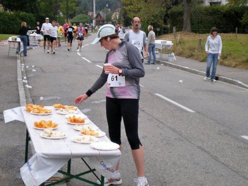 Fünfzehn Kilometer liegen hinter mir, als ich mir beim dritten Verpflegungsposten Cola und Wasser gönne. Die Tische sind immer schön angerichtet, die verschiedenen frischen und gedörrten Früchte schön angerichtet, das „pain d’épice“ akkurat in Streifen geschnitten. Liebevoll wird für die Läufer gesorgt. Rund 700 Teilnehmer sind es bei allen drei Disziplinen und 250 Freiwillige sind im Einsatz. Eine beeindruckende Zahl.