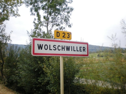 Die Straße nach Wolschwiller ist eine der typischen Baumalleen Frankreichs. Aber weder die Bäume noch der hochstehende Mais nebenan vermögen den Wind abzuhalten, der uns nun stark auffrischend von rechts, aus westlicher Richtung eine Bremswirkung beschert.