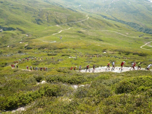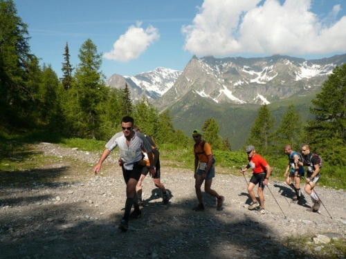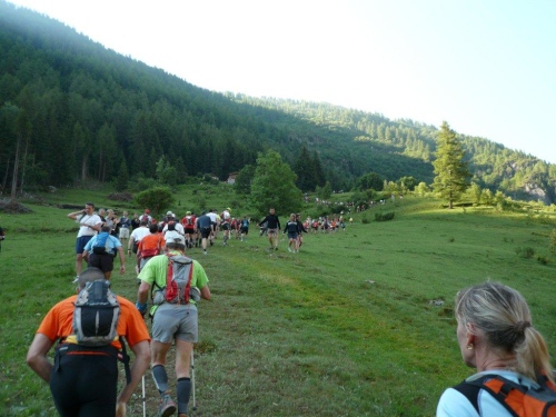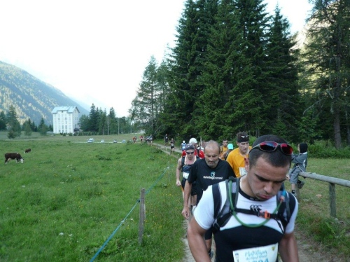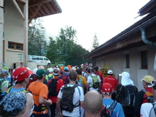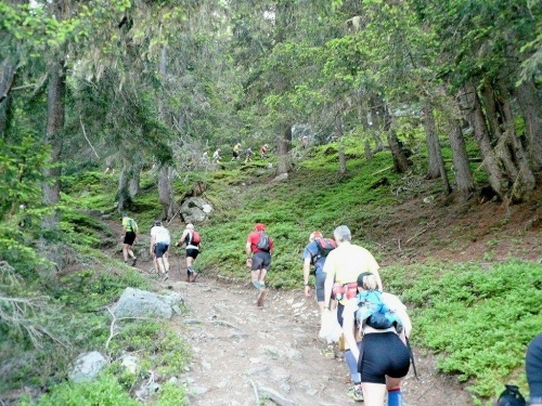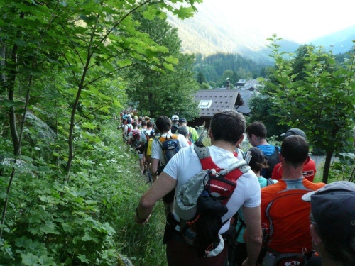 Zuerst geht es durch die Straßen aus der Stadt hinaus, am Centre Sportif vorbei, wo an einer Häuserecke vorbei ein Engpass ist, an welchem erstmals die Zeit gemessen wird. Nach diesem Flaschenhals geht es über einen beliebig breiten Wiesenweg in bewaldetes Gebiet am Talgrund, teilweise der Arve entlang, mit gut zu belaufender Naturstraße. Das Feld ich dicht beisammen und nach sechs Kilometern gibt es vor Le Lavancher nochmals ein Nadelöhr, an welchem es einen Moment lang keinen Zentimeter vorwärtsgeht. Den einen oder anderen Sportskameraden hindert dieser Stau aber nicht daran, sich an den geduldig aufs Weitergehen Wartenden vorbeizudrücken.