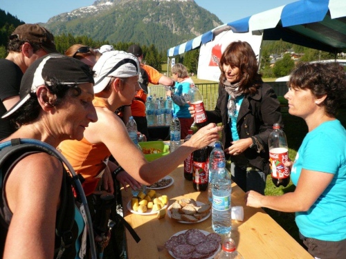 Von der Passhöhe nach Vallorcine sind es knapp vier Kilometer und 200 negative Höhenmeter, also ideales Gefälle, um es rollen zu lassen. Kurz vor dem Verpflegungsposten verlassen wir den Schatten und können uns beim Verweilen am reichhaltigen Buffet von den Sonnenstrahlen kitzeln lassen. Riegel, Bananen, Orangen, Salami, Brot, Käse, Trockenfrüchte, Cola, Iso, Wasser – für jeden ist etwas dabei. Es empfiehlt sich zuzugreifen, denn kaum 200 Meter später beginnt der nahrhafte Aufstieg zum Col des Posettes.
