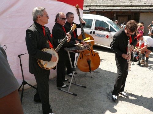 Nach einem weiteren Anstieg in einem typischen alpinen Wald geht es nach Argentière, wo nach zehn Kilometer eine erste Getränkestation aufgebaut ist und eine schräge Combo jazzige Töne mit auf den weiteren Weg gibt. Zwischen den paar Häusern, wie schon vorher an verschiedenen Punkten entlang der Strecke, sind Gruppen von Zuschauern, welche die Läufer anfeuern und dabei viel Respekt zum Ausdruck bringen. Nach einem weiteren Anstieg geht es hinunter nach Montroc, auf einen Teil der Strecke, den wir heute nochmals unter die Sohlen bekommen.