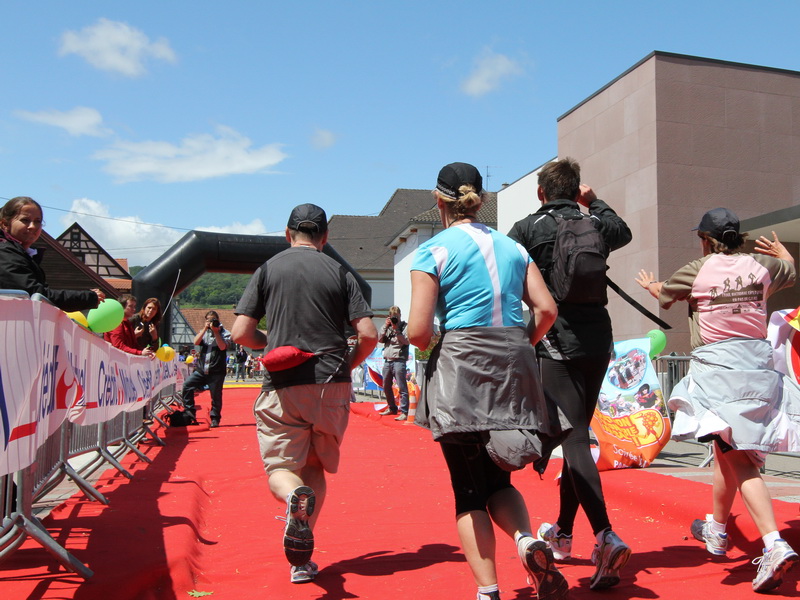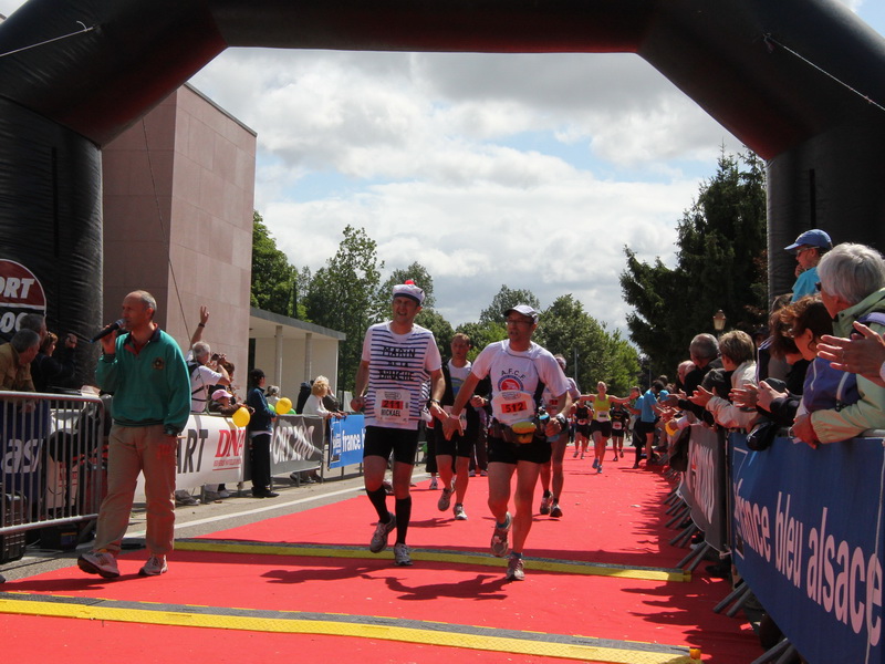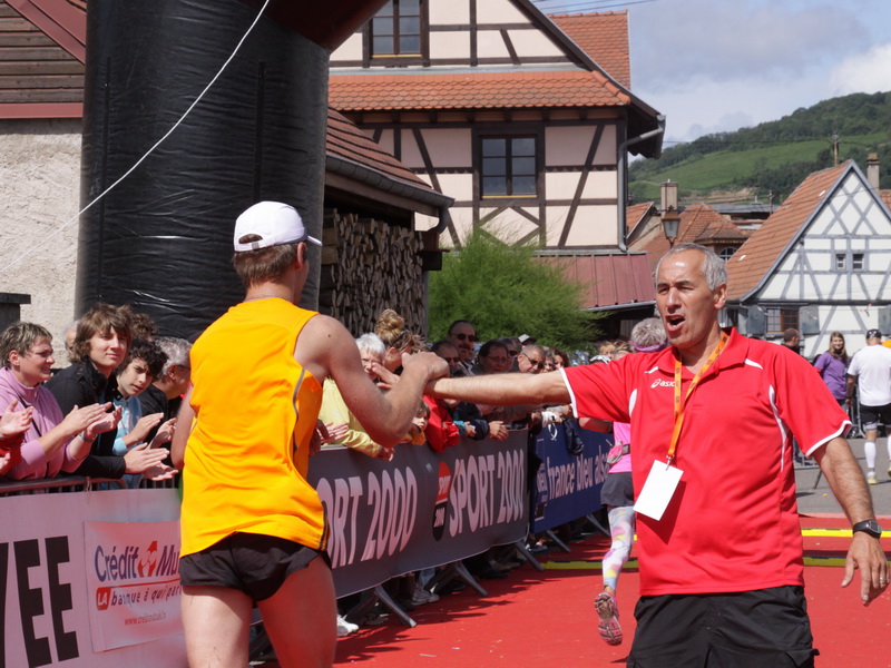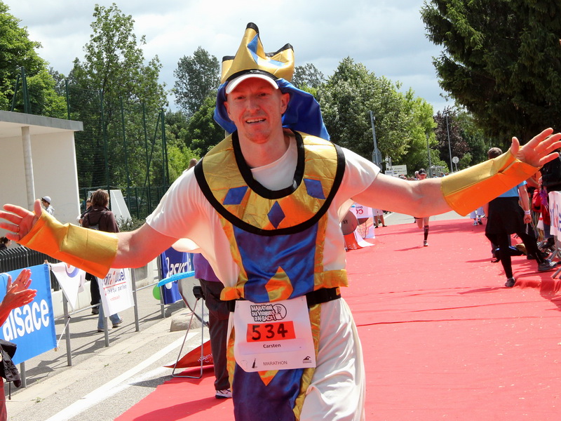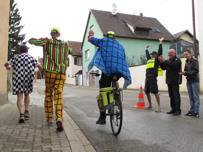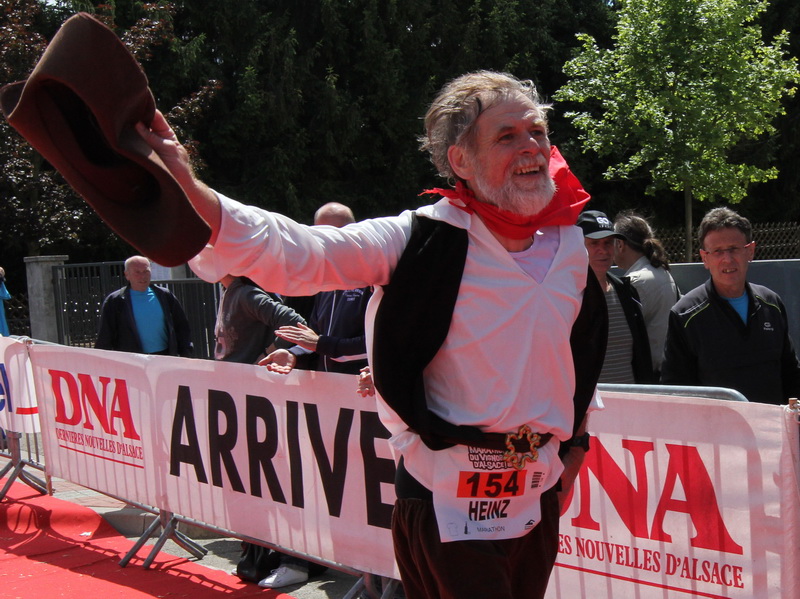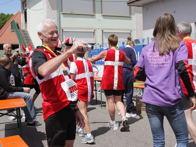 Laufen nicht vergessen. Die Wege sind jetzt meist asphaltiert und flach. Helfen tut mir das nicht, die Kräfte lassen nach. Trotzdem kann ich immer mehr ‘’Halbe’’ einsammeln, was die aber nicht im Geringsten stört. In Avolsheim wird bei Muscat und Süßigkeiten kräftig zugelangt. Hat man die St. Ulrich Kirche passiert, ist die Strecke topfeben und gerade. Normalerweise sind solche Passagen kurz vor dem Ziel nicht sehr geliebt. Sie nehmen kein Ende. Heute ist das egal. Kenner haben auch noch gar nicht das Ziel im Sinn, sondern den Cremant, der keinen Kilometer vor dem Zielbogen ausgeschenkt wird. Hier vertreiben sich einige die Zeit, bis sie mit dem Besenwagen ins Ziel laufen können. Solange wird dort auch gewartet und jeder Finisher gefeiert.