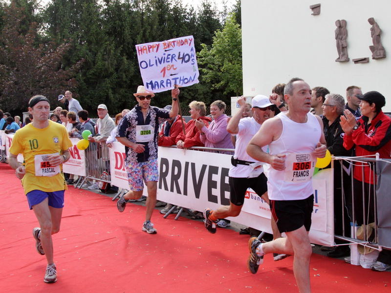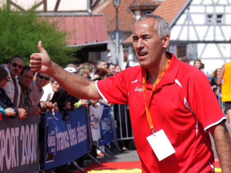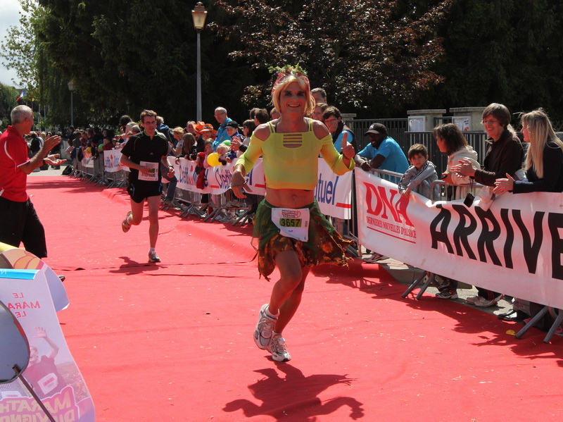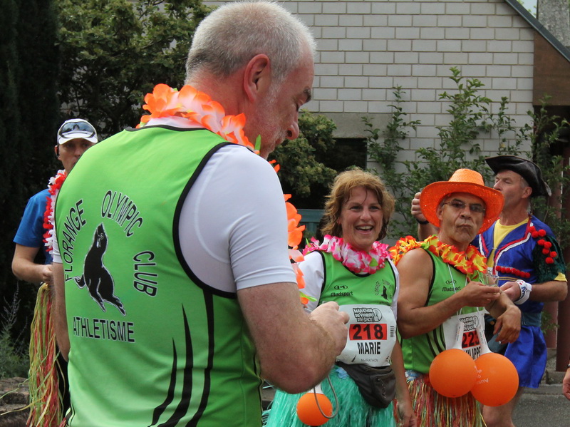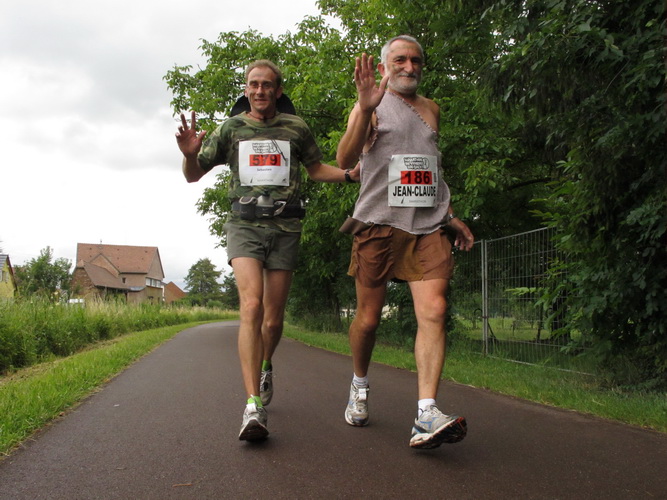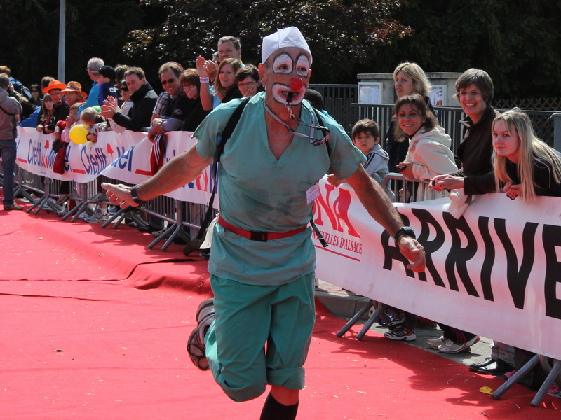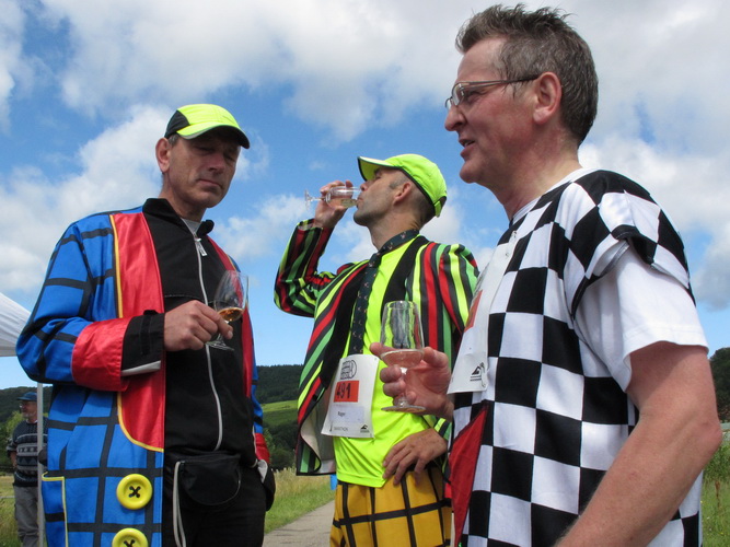 Laufen nicht vergessen. Die Wege sind jetzt meist asphaltiert und flach. Helfen tut mir das nicht, die Kräfte lassen nach. Trotzdem kann ich immer mehr ‘’Halbe’’ einsammeln, was die aber nicht im Geringsten stört. In Avolsheim wird bei Muscat und Süßigkeiten kräftig zugelangt. Hat man die St. Ulrich Kirche passiert, ist die Strecke topfeben und gerade. Normalerweise sind solche Passagen kurz vor dem Ziel nicht sehr geliebt. Sie nehmen kein Ende. Heute ist das egal. Kenner haben auch noch gar nicht das Ziel im Sinn, sondern den Cremant, der keinen Kilometer vor dem Zielbogen ausgeschenkt wird. Hier vertreiben sich einige die Zeit, bis sie mit dem Besenwagen ins Ziel laufen können. Solange wird dort auch gewartet und jeder Finisher gefeiert.