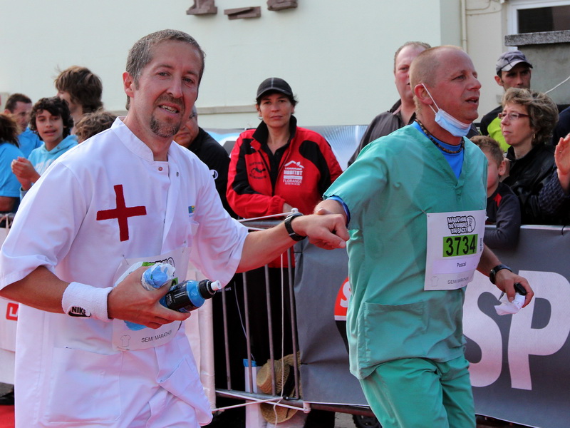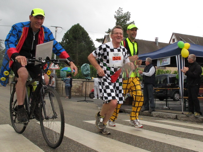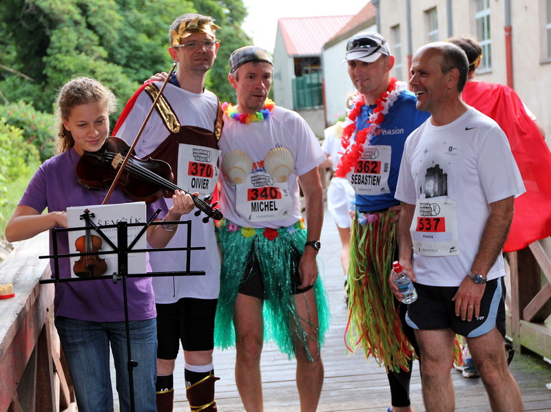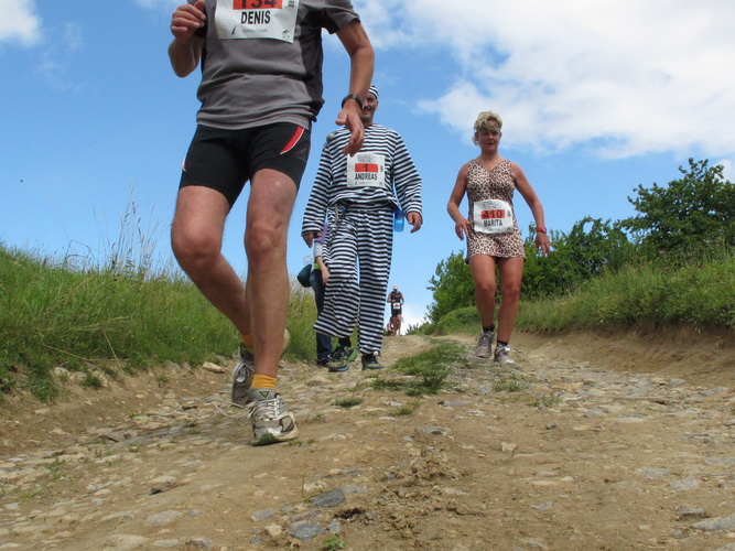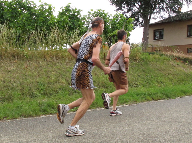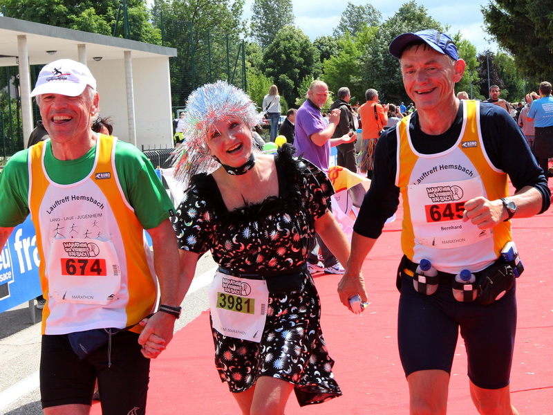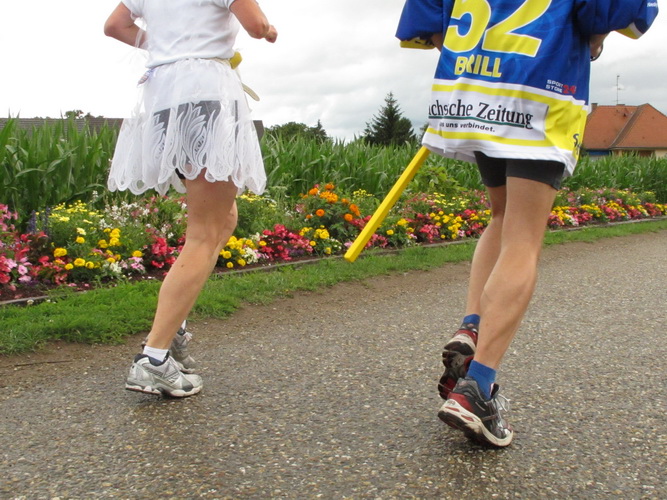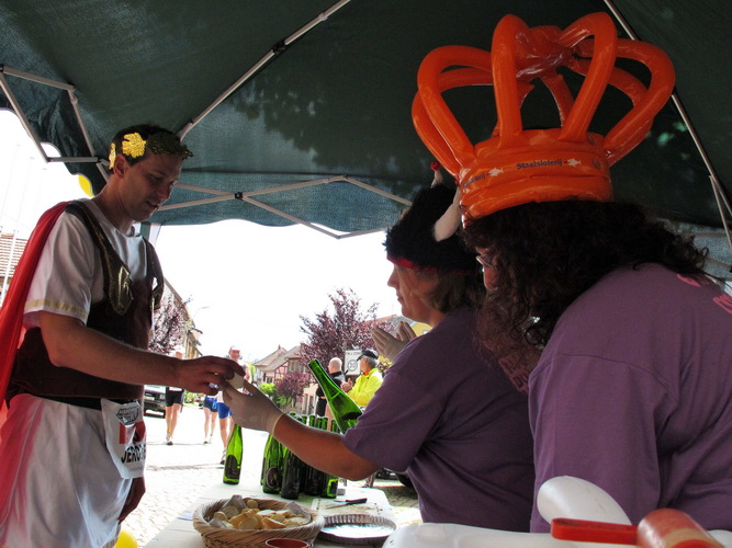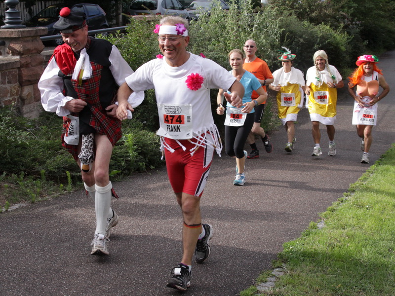 Zuschauer sind hin und wieder auch an der Stecke, aber die braucht man eigentlich nicht. Für die phantastische Stimmung sorgen die Läufer selber mit ihren lustigen Kostümen, Gesängen und Sprüchen. Sogar einige Fahrradbegleiter sind kostümiert.