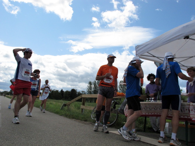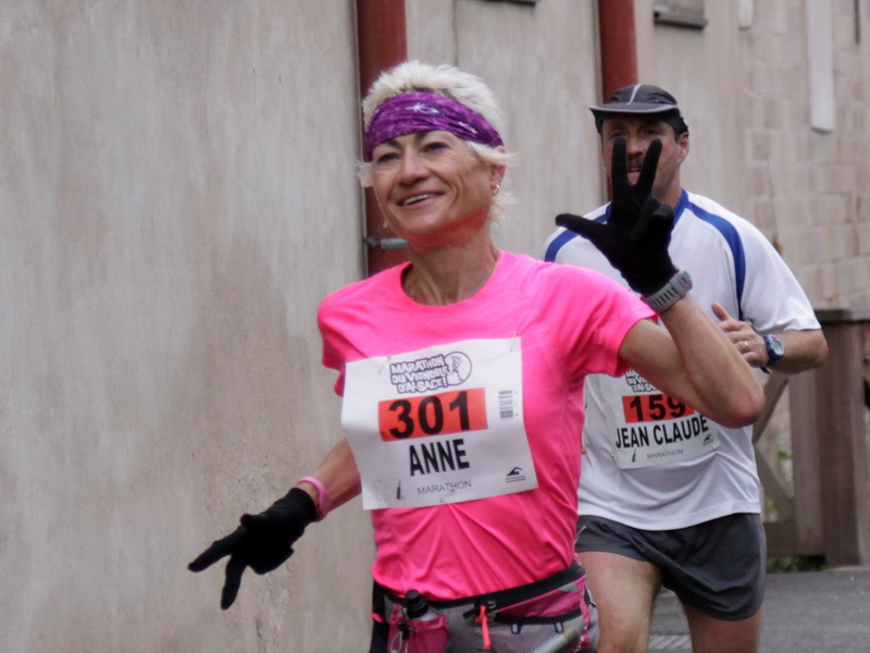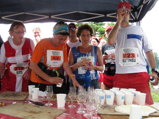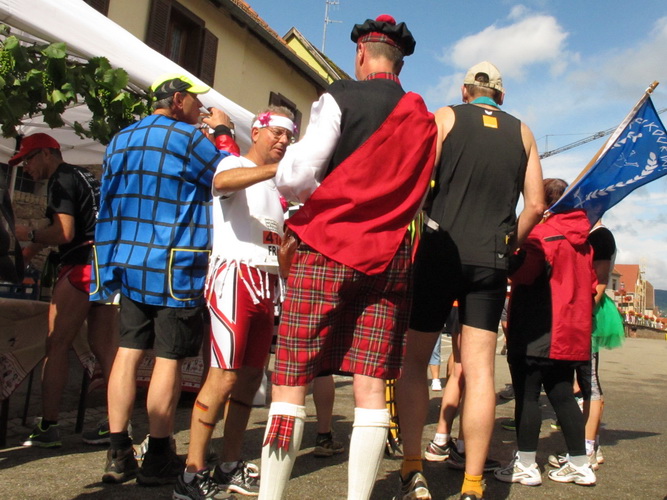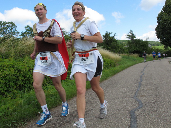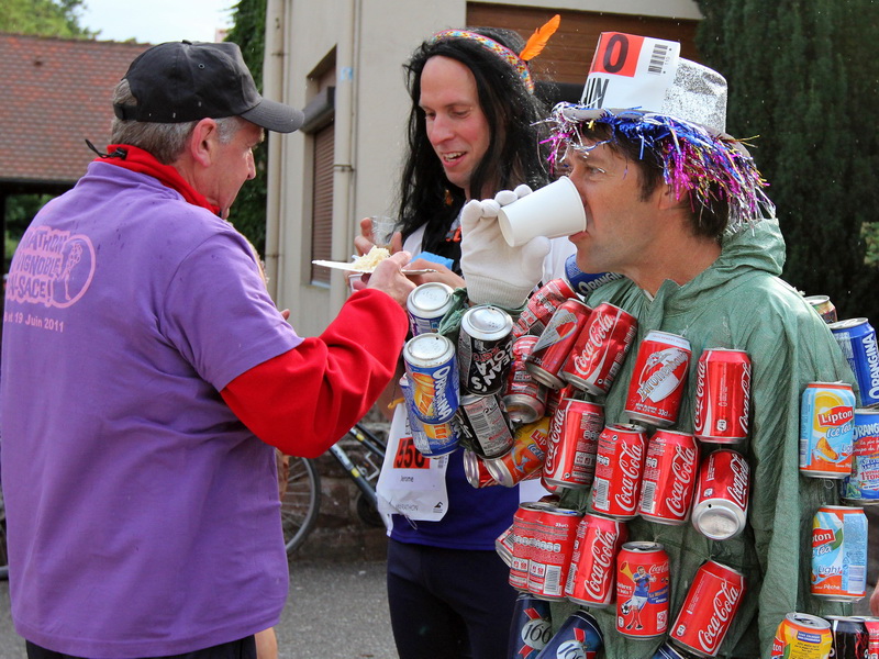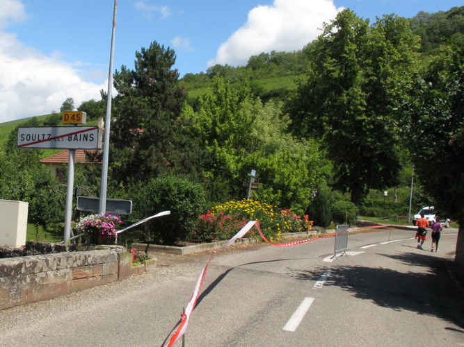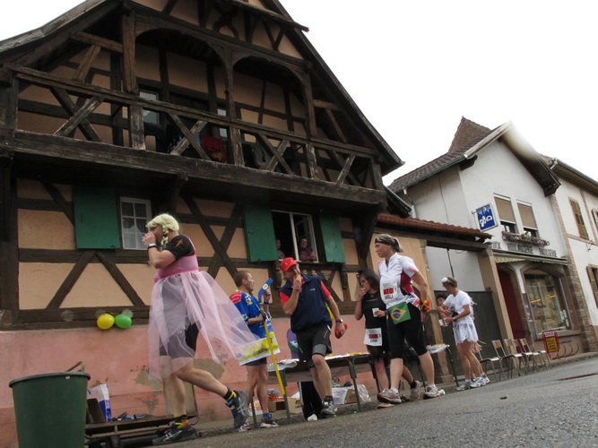 Auch der weitere Weg ist meist recht hügelig. Dafür hat man immer wieder schöne Ausblicke auf Felder, Wiesen und Weinberge, auf Ortschaften und die Berge. In Dangolsheim (km 36) hole ich tatsächlich ein paar Halbmarathonläufer ein und habe damit auf 15 km 30 Minuten aufgeholt. Was sind das denn für Feierbiester? Ich probiere kurz von der Pastete und mache mich auf den Weiterweg nach Soultz les Bains. Obwohl die Verpflegungsstelle dort alkoholfreie Zone ist, ist die Stimmung bombig. Zum ‘’Anton aus Tirol’’ wird gesungen und getanzt.