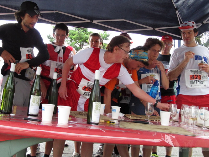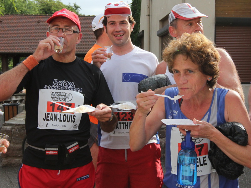 Dann kann man in Molsheim (km 9,5) die Dosis gleich noch steigern, diesmal mit Riesling, der zu den beliebtesten weil besten Sorten im Elsass gehört. Dazu gibt es Sauerkraut. Richtig – Sauerkraut! Und die Nachfrage ist groß. Die Deutschen werden ja wegen ihrer Vorliebe zum Spitzkohl als Krauts bezeichnet, obwohl die Elsässer die Erfindung (wie übrigens auch die der Spätzle) für sich reklamieren. Immer rein, den Läufern ist das egal.