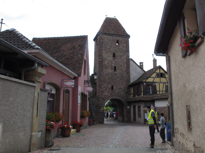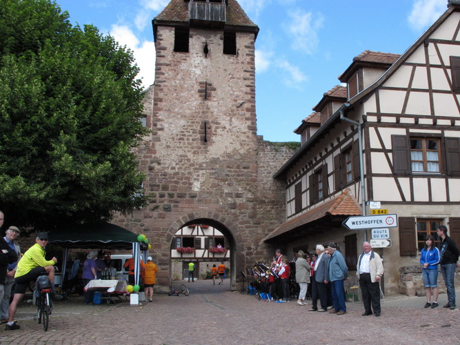 Bevor Wangen (km 29) erreicht wird, muss eine weitere Steigung genommen werden. Vor dem Niedertorturm aus dem 16. Jahrhundert spielt eine Trachtenkapelle. Es gibt verschiedene Wurstspezialitäten und Riesling. Dann laufen wir durch den Ort und verlassen ihn, wie wir ihn betreten haben: durch ein mittelalterliches Tor.