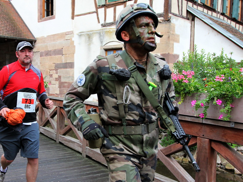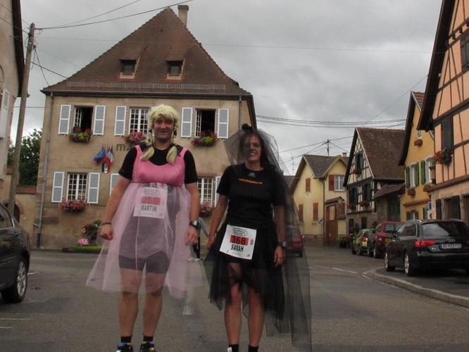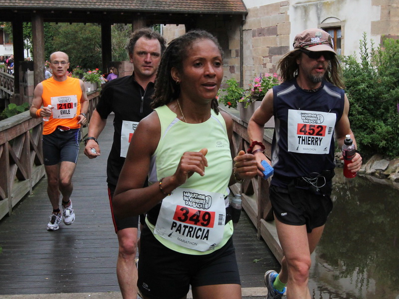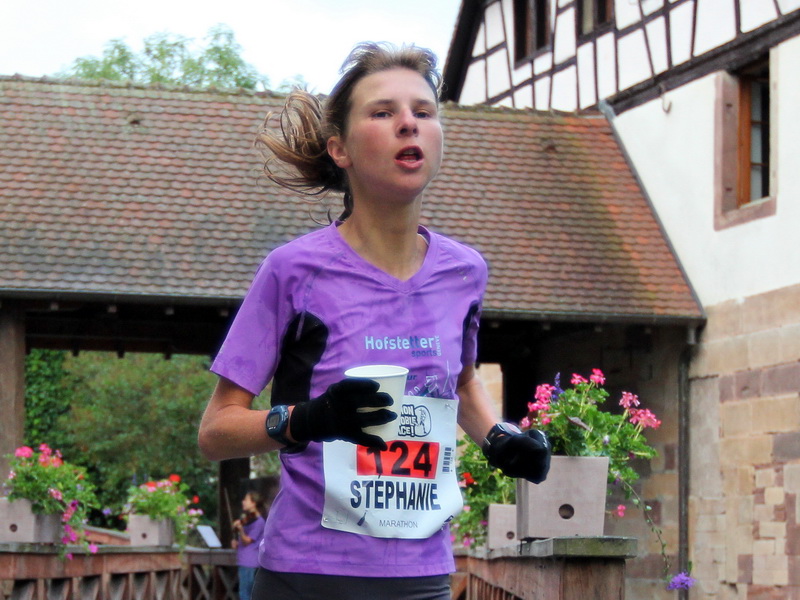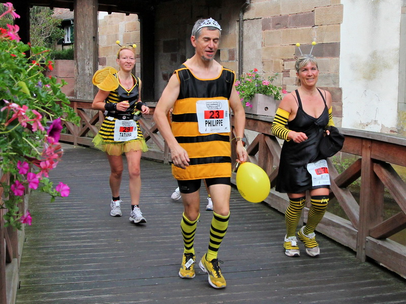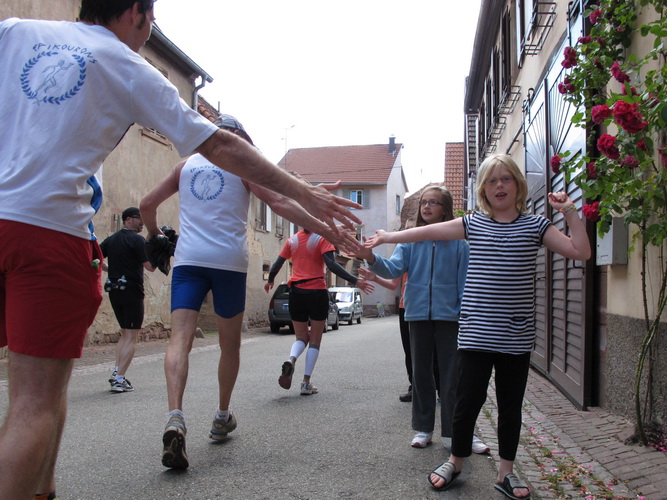 Abwärts geht es durch den Ort nach Odratzheim. Hier fallen wieder die herrlich hergerichteten und mit vielen Blumen geschmückten alten Fachwerkhäuser auf. Es gibt Wasser für innen und außen und heiße Rockrhythmen. Nach dem hügeligen Örtchen laufen wir flach an einem Bächlein entlang weiter in Richtung Marlenheim (km 26), dem nördlichsten Ort der 170 km langen Elsässer Weinstraße. Dazwischen gibt es in Kirchheim zu handgemachter Musik wieder mal Sport-Food, was aber kaum beachtet wird. Recht flott läuft man auf dem flachen, asphaltierten Wirtschaftsweg dem Weinort entgegen, um die nächste Probe mit Nudelsalat bei Blasmusik zu absolvieren.