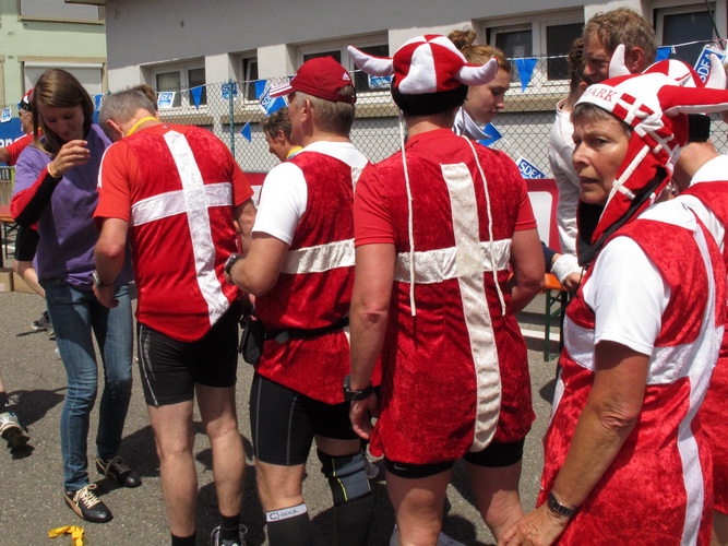 Über eine Holzbrücke kommen wir zum Campingplatz beim Zielgelände, das zum Glück noch Stunden auf uns warten muss. Der Regen hat längst wieder aufgehört, der Himmel hellt sich im Westen auf und die Temperaturen bleiben knapp unter 20 Grad. Das ist gut für die Läufer, denn unter Hitze leidet ja bekanntlich die Alkoholverträglichkeit. Schon wieder überholt mich die Horde Dänen, alle in ihren Landesfarben gekleidet und von einigen Zuschauern fälschlicherweise als Schweizer begrüßt. „We are Danish Dynamite“, wird reklamiert.