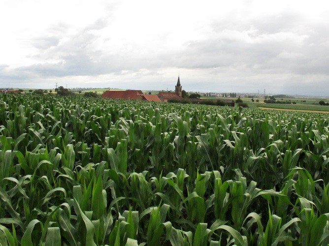 Der Weg nach Dahlenheim (km 19) ist ziemlich beschwerlich. Es geht teilweise etwas steil in die Weinberge. Die Wiesenwege haben tiefe, unebene Fahrspuren, in der Mitte steht hohes Gras. Landschaftslauf pur. Dazu gibt es schöne Ausblicke über Getreidefelder und Wiesen auf kleine Ortschaften, Weinberge und auf die Ausläufer der Vogesen. Vorbei an der Wallfahrtskapelle Maria Altbronn kommen wir nach Dahlenheim. Bratwurst steht auf der Speisekarte. Die ist so lecker, dass ich mir eine „Portion am Stück“ geben lasse. Anderen ist der Pinot Blanc wichtiger.
