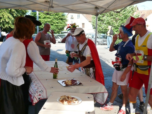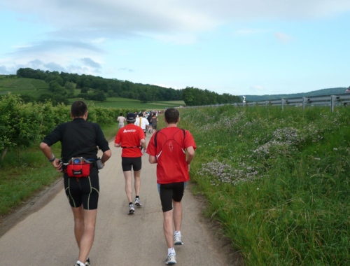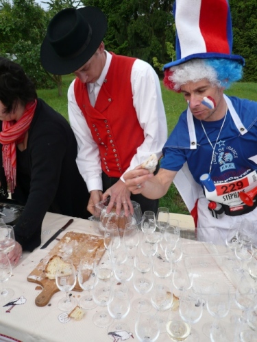 Nun stellt sich die Frage: „non merci“ oder „oui merci“, oder auch, da die Elsässer deutsch sprechen, ja danke bzw. nein danke. Restwein habe ich noch von gestern so beginnt mein Frühstück mit Gugelhupf. Viele schlagen schon richtig gut beim Wein zu. Aber, Vorsicht man sollte nur probieren, denn die Strecke ist noch lang und es warten noch viele Höhenmeter mit zum Teil schlechten Laufuntergrund.