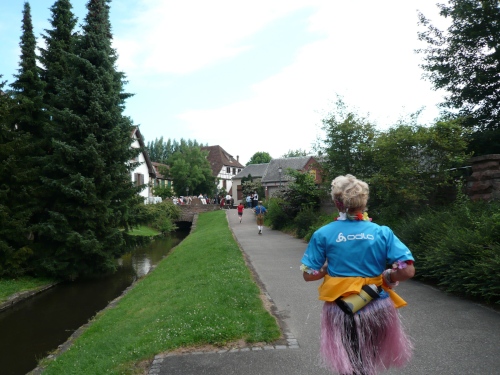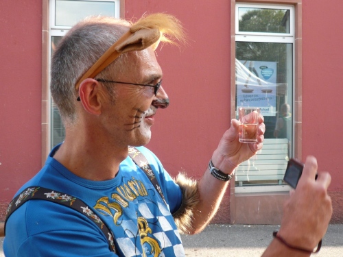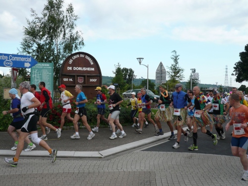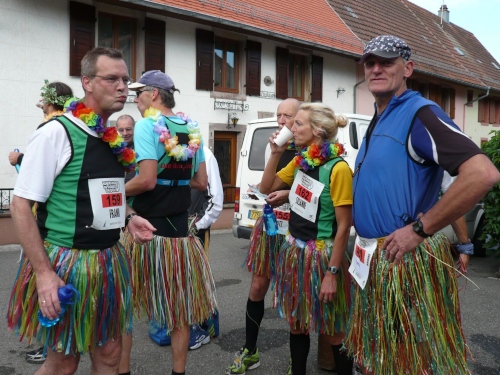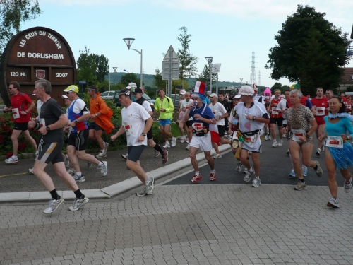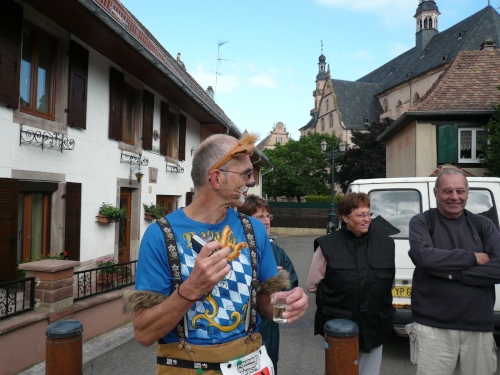 Der Start ist erfolgt und die Gruppe kommt langsam in Bewegung. Wir haben heute 6 Stunden Zeit die Strecke und die kulinarischen Leckerbissen zu genießen. Der Zielschluss wird aber nicht ganz so eng genommen, denn auch der 562. mit einer Zeit von 6:19:17 kommt noch in die Ergebnisliste und wird herzlichst im Ziel empfangen. Wir starten in Dorlisheim und werden 17 elsässische Orte durchlaufen.