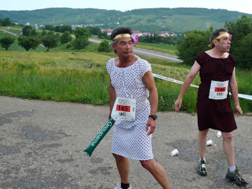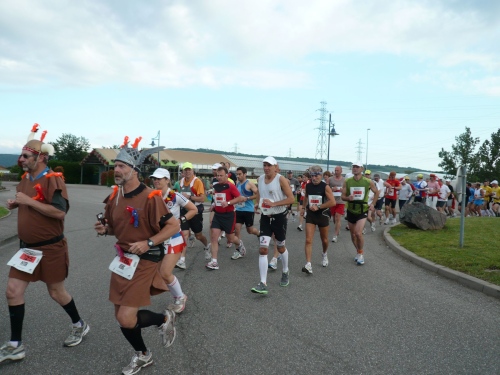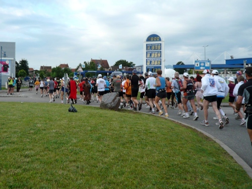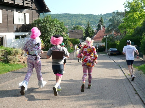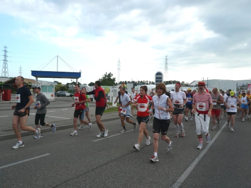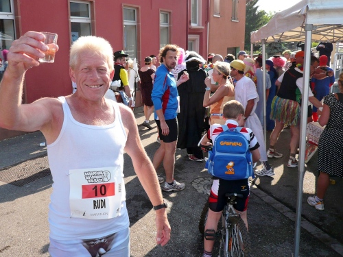 Fünf Minuten vor halb Acht Uhr gehen alle Teilnehmer zum Startplatz neben dem Cora. Hier hat man das Gefühl, gleich geht der Karnevalsumzug der 5. Jahreszeit los, aber nein es sind nur die vielen Läufer die der Aufforderung des Veranstalters nachgekommen sind sich zu verkleiden, so wie es beim Medoc-Marathon gang und gebe ist. Jetzt die vielen tollen Kostüme aufzuzählen wäre langweilig aber durch die Fotos erhaltet ihr einen kleinen Einblick in die ca. 600 Personen große Marathongruppe.