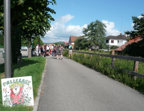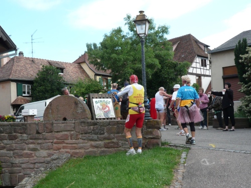 Nun aber zurück von 1001 PS auf 1 MS (Menschenstärke). Wir durchlaufen den Ort und kommen schon bei Km 2,5 zum 1. Gourmet-Verpflegungsstand. Vor jedem Gourmet-Verpflegungstand gibt es Schilder die den Arbeitsweg des Winzers vom Rebstock zum Wein zeigen. Hier gibt es Gugelhupf und dazu Sylvaner Weißwein. Der Kougelhopf ist ein Napfkuchen mit oder ohne Rosinen und in ganz Europa unter verschiedenen Namen bekannt. Die Sylvanertraube gehört zu den ältesten heute noch kultivierten Reben mit einem zwar weniger ausgeprägtem Fruchtspiel, aber dafür einem exzellenten Terrior-Anzeiger. Hier im Elsass ist das zweitgrößte Anbaugebiet nach Rheinhessen für diesen Wein, der es sogar mit dem Chardonnay aufnehmen kann. Der Wein ist in über 120 verschiedenen Namen rund um die Welt bekannt, z. B. Frankenriesling, Grüner Silvaner, Monterey Riesling, Österreicher, Zierfandl.