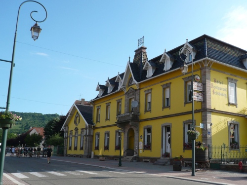 Die Strecke führt uns über Wirtschaftswege durch Maisfelder, Obstgärten und Wiesen und einem ersten Anstieg nach Mutzig. Historisch gesehen bietet der Ort ein Stadttor aus dem 14. Jahrhundert, einer von 1787 erbauten Synagoge die die älteste in ihrer gesamten Bausubstanz erhaltenen des Elsass, sowie dem Château des Rohan einem Barockschloss aus dem 17. Jahrhundert. Ursprünglich bekannt steht Mutzig jedoch für seine Bierbrauer-Tradition. Die alte, 1990 stillgelegte Brauerei ist ein Bau im historisierenden Stil einer Raubritterburg, an der noch die gotischen Blocklettern des elsässischen Bieres prangen, das so heißt wie der Ort - eben Mutzig.