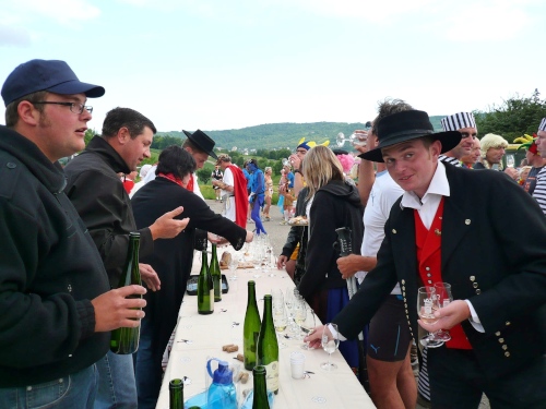 Hier kommen wir an den 3. Gourmet-Verpflegungsstand. Es gibt Laugenbrezeln und Riesling. Die Riesling Traube gilt als eine der besten Weißweintraube und deren Weine genießen international hohes Ansehen. In Frankreich wird er ausschließlich im Elsass angebaut und zählt zu den Alsace Grand Cru Weinen. Hier ist unser Bayer Bernie im Element, Brezeln wie zu Hause.