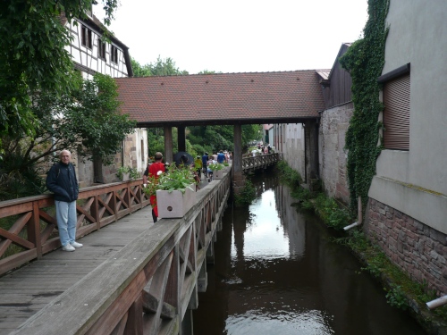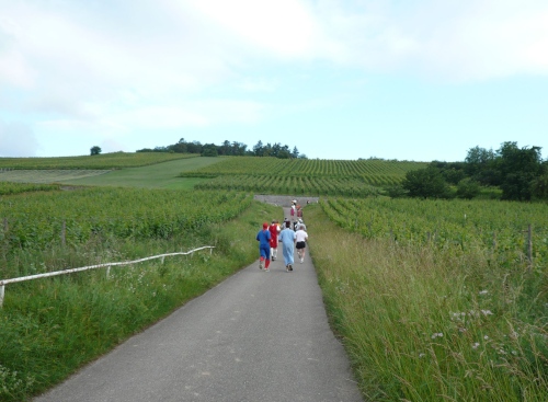 Hier kommen wir kurz vor dem Stadttor an den 2. Gourmet-Verpflegungsstand. Es gibt Rosinenrodon und Pinot Blanc. Obwohl wir in einem historischen Bierbrauerort sind gibt es Wein. Der Pinot Blanc (Weißburgunder, Chardenay, Ruländer weiß) ist seit dem 14. Jahrhundert schon bekannt und ist die hellste aller Burgundersorten. Die größten Rebflächen bei uns gibt es in der Pfalz, Rheinhessen und im Badischen.