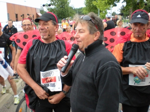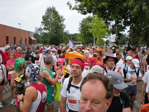 Vom Marathonvillage gehen zahlreiche Shuttlebusse zum 2 Kilometer entfernten Parkplatz des Cora-Marktes, wo der Start stattfindet. Wer mag, der geht zu Fuß oder nimmt das eigene Auto. Dort beim Cora liegen die Startnummern, die nicht am Vorabend abgeholt wurden. Alles sehr entspannt. Doch es gab einige Franzosen, die kamen zu spät. Kein Problem: Die erste Matte, an der der kostenlos ausgeliehene Chip registriert wird, ist bei km 21,1 .