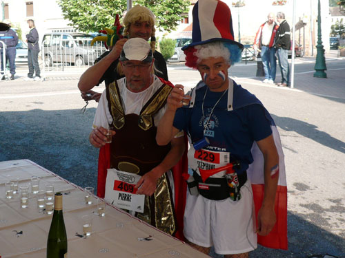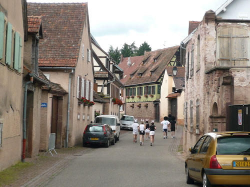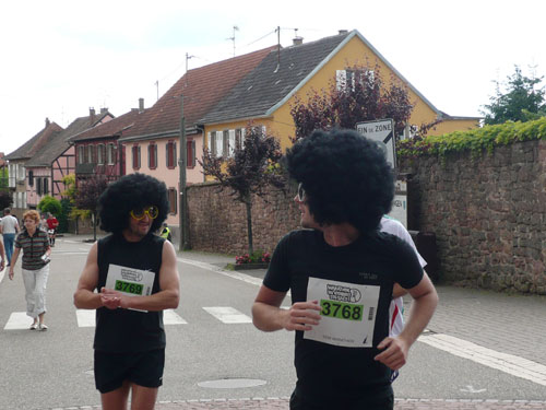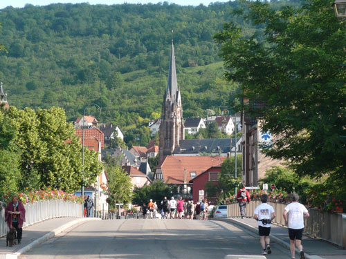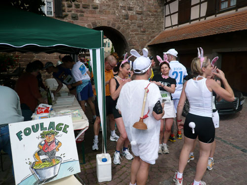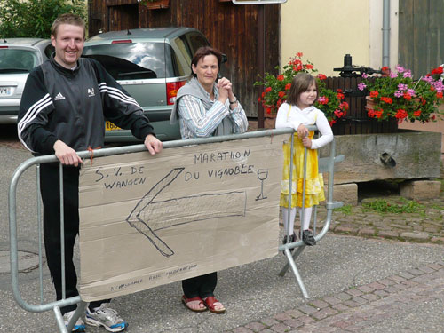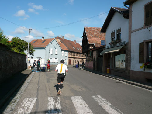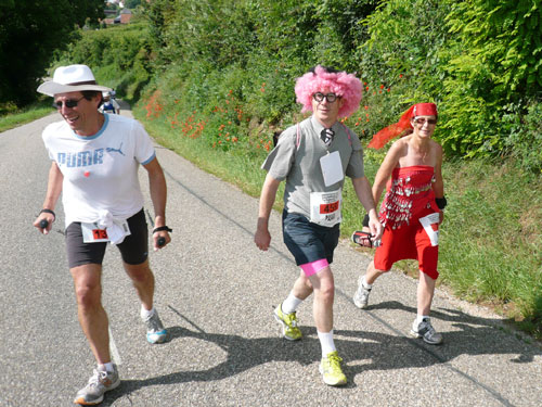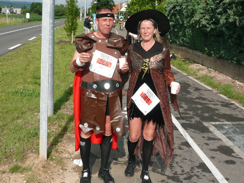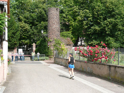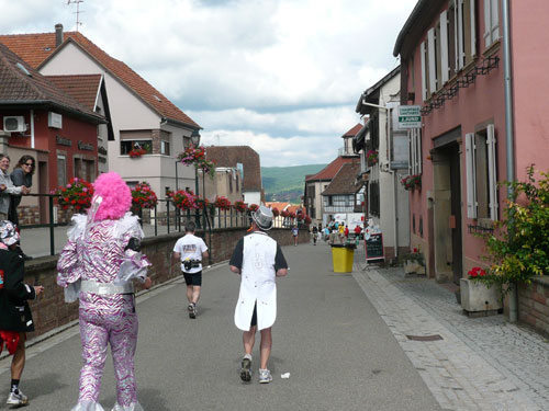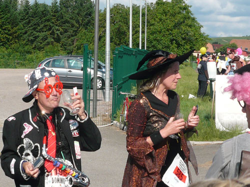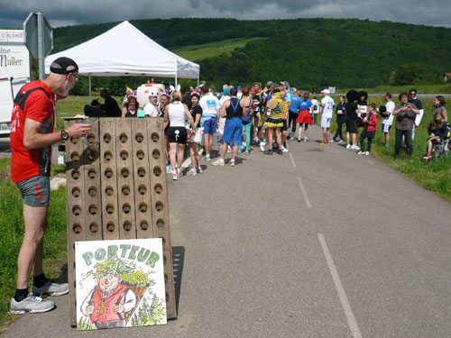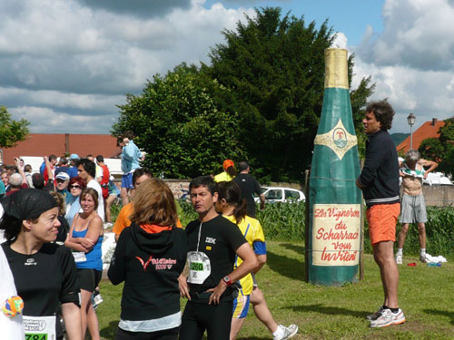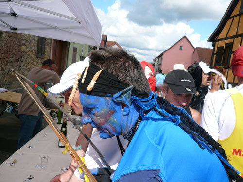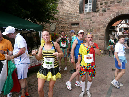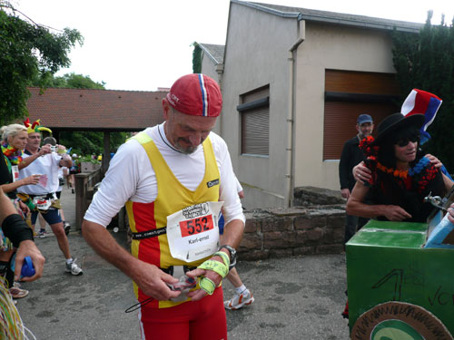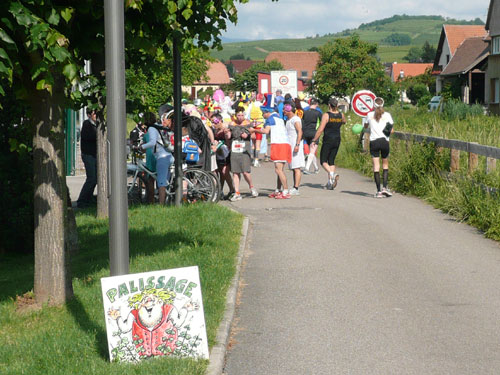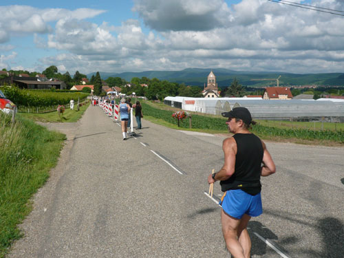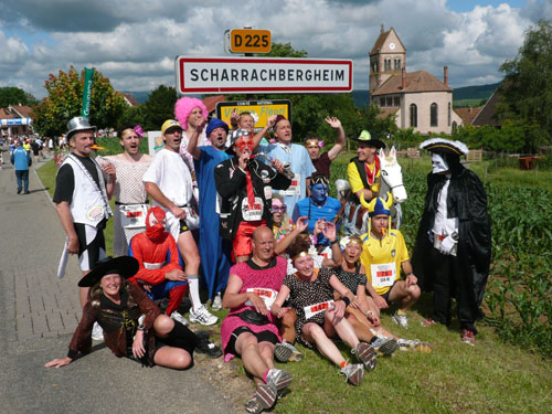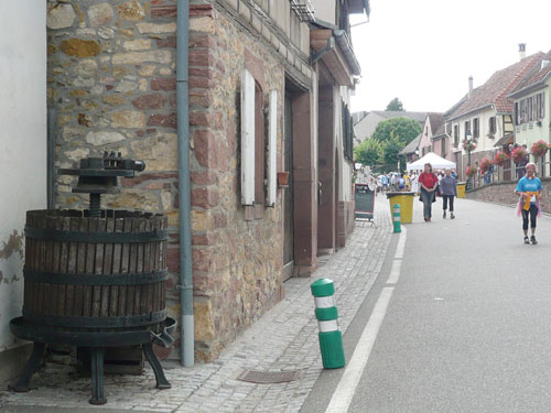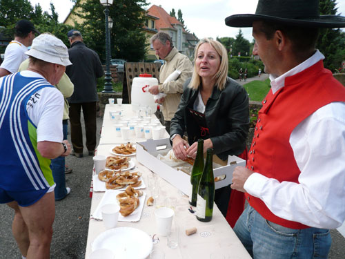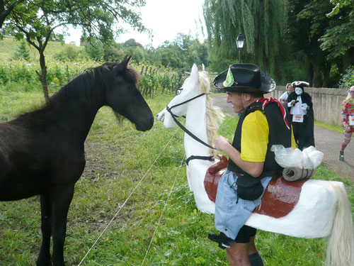 Die Beine werden langsam schwerer, gut dass der folgende Kilometer aus der Ortschaft abwärts führt. An einer Pferdekoppel steht Lucky Luke und lässt seine Jolly Jumper mit rassigen schwarzen Pferden schmusen. Eine einmalige Szene, keiner der des Weges kommt, kann sich ihr entziehen. Ich könnte mich kugeln vor Lachen. Über wunderschöne kleine Ortschaften geht es nach Marlenheim. Hier ist der nördlichste Punkt unseres Kurses und das Tor zur 170 km langen Elsässer Weinstraße und wird daher auch offiziell Porte de la Route des Vins d'Alsace genannt. Zwischen den Degustation zieht sich das Läuferfeld immer auseinander, aber am Weinstand versammelt sich die Meute wieder für einige Zeit und lässt den Winzer hochleben.