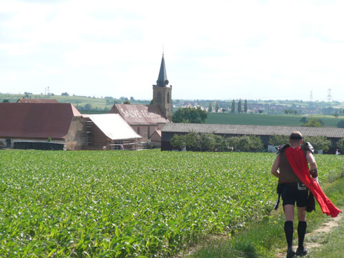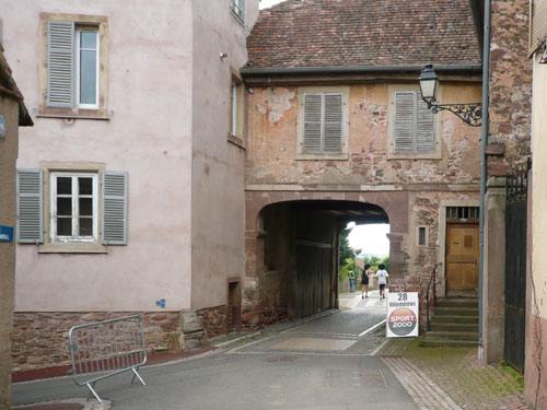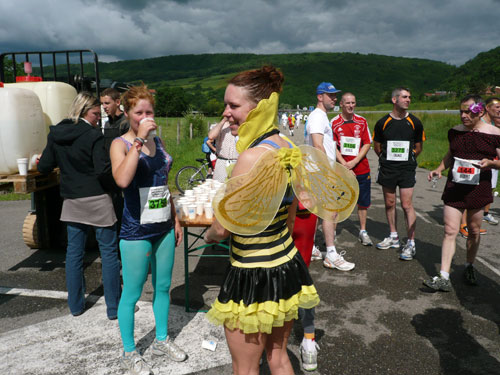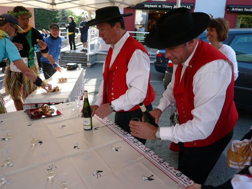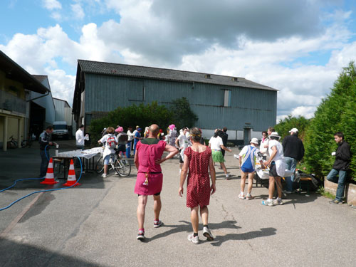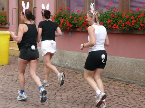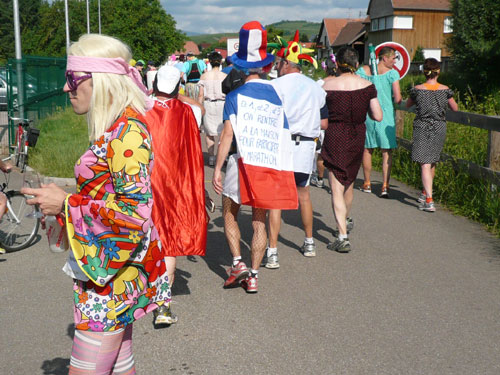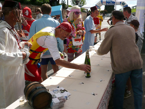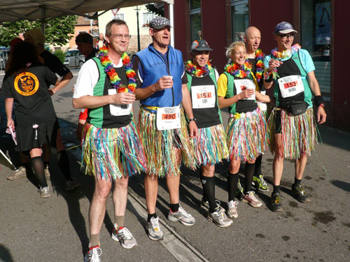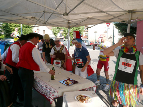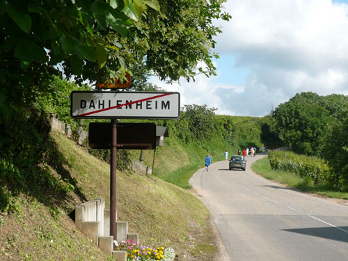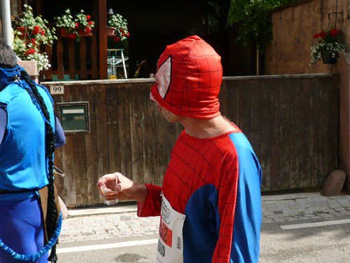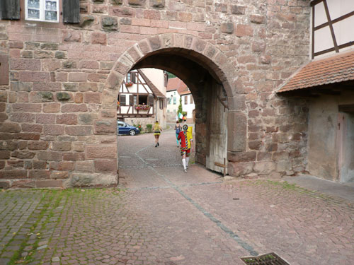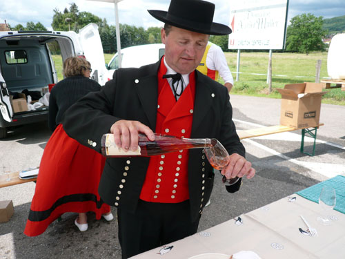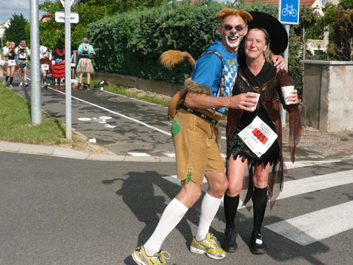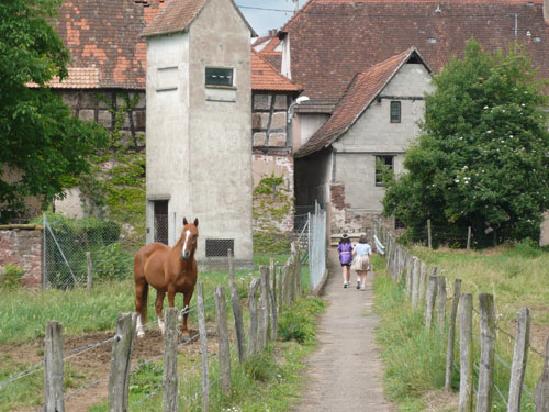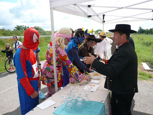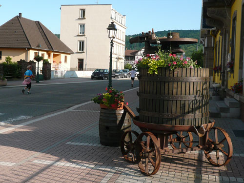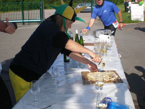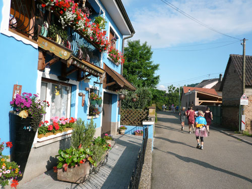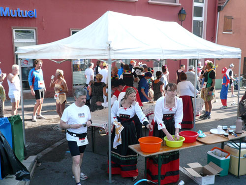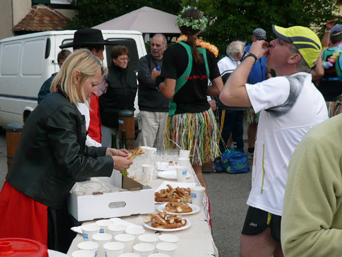 Die Beine werden langsam schwerer, gut dass der folgende Kilometer aus der Ortschaft abwärts führt. An einer Pferdekoppel steht Lucky Luke und lässt seine Jolly Jumper mit rassigen schwarzen Pferden schmusen. Eine einmalige Szene, keiner der des Weges kommt, kann sich ihr entziehen. Ich könnte mich kugeln vor Lachen. Über wunderschöne kleine Ortschaften geht es nach Marlenheim. Hier ist der nördlichste Punkt unseres Kurses und das Tor zur 170 km langen Elsässer Weinstraße und wird daher auch offiziell Porte de la Route des Vins d'Alsace genannt. Zwischen den Degustation zieht sich das Läuferfeld immer auseinander, aber am Weinstand versammelt sich die Meute wieder für einige Zeit und lässt den Winzer hochleben.