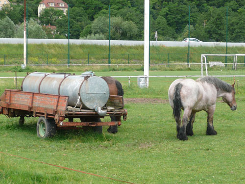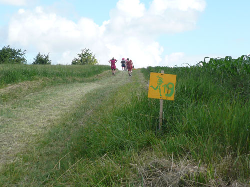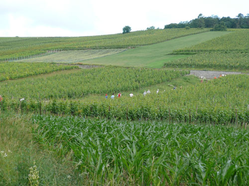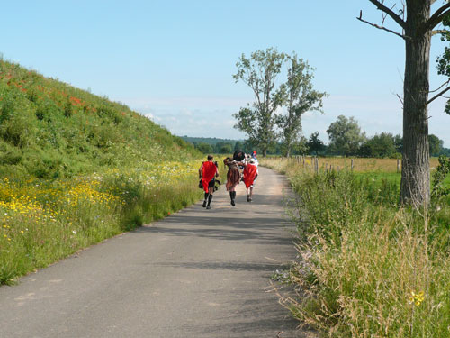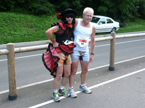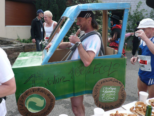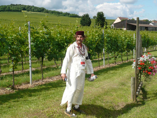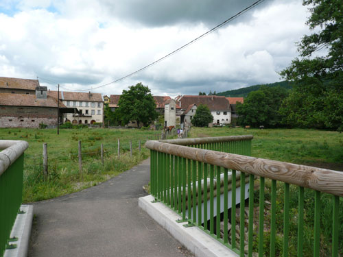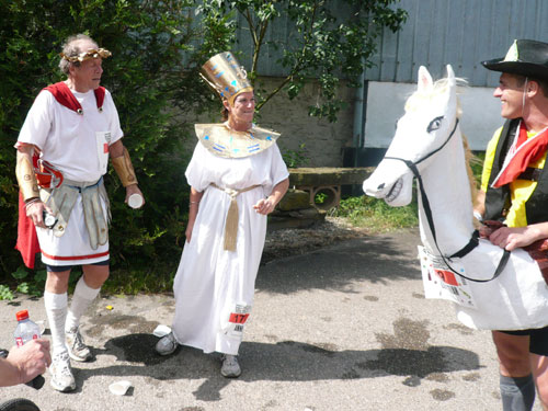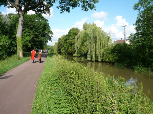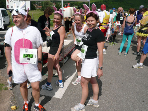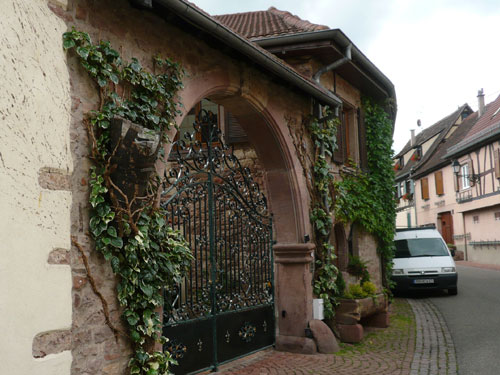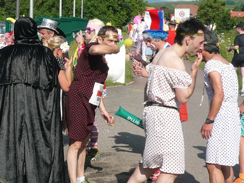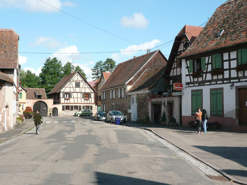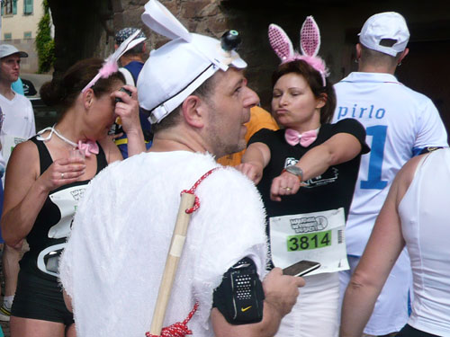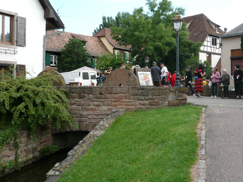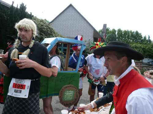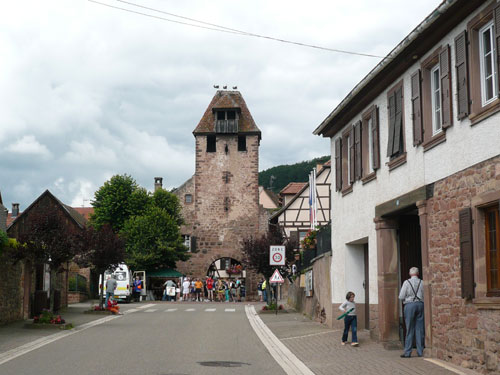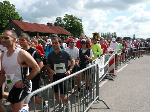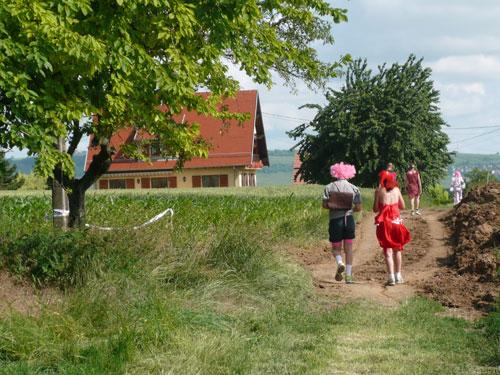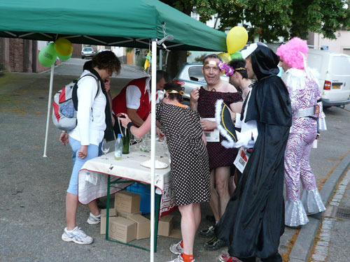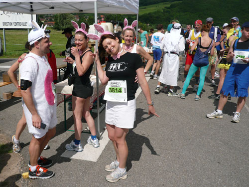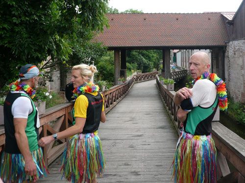 Die Beine werden langsam schwerer, gut dass der folgende Kilometer aus der Ortschaft abwärts führt. An einer Pferdekoppel steht Lucky Luke und lässt seine Jolly Jumper mit rassigen schwarzen Pferden schmusen. Eine einmalige Szene, keiner der des Weges kommt, kann sich ihr entziehen. Ich könnte mich kugeln vor Lachen. Über wunderschöne kleine Ortschaften geht es nach Marlenheim. Hier ist der nördlichste Punkt unseres Kurses und das Tor zur 170 km langen Elsässer Weinstraße und wird daher auch offiziell Porte de la Route des Vins d'Alsace genannt. Zwischen den Degustation zieht sich das Läuferfeld immer auseinander, aber am Weinstand versammelt sich die Meute wieder für einige Zeit und lässt den Winzer hochleben.