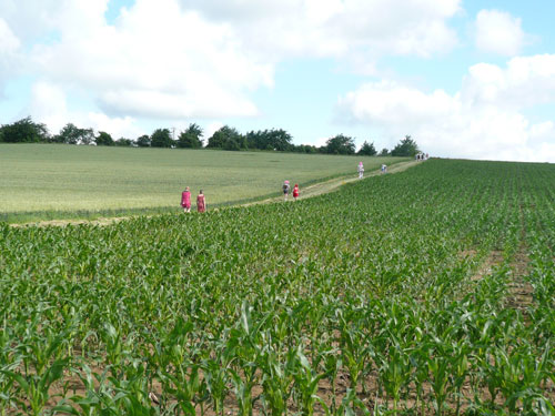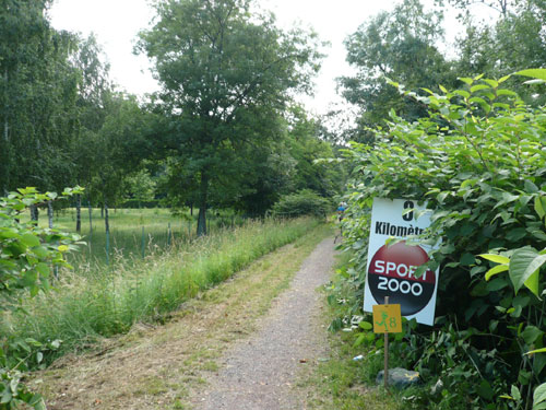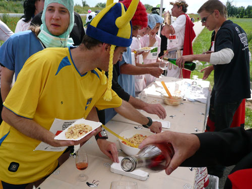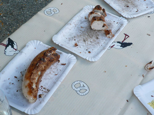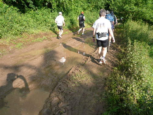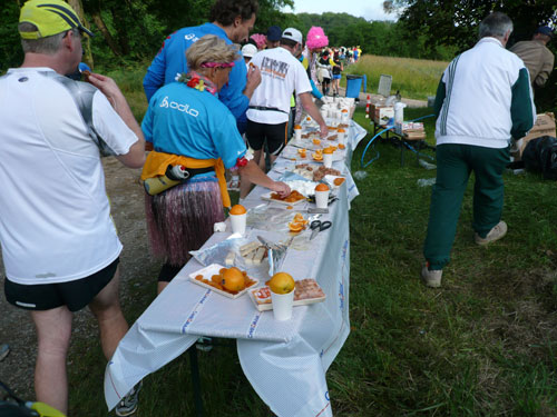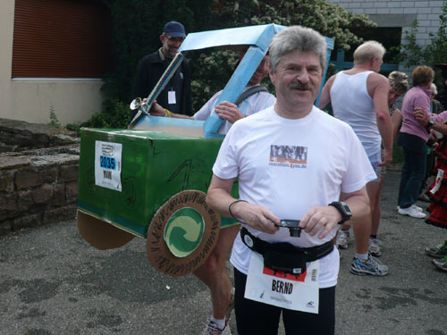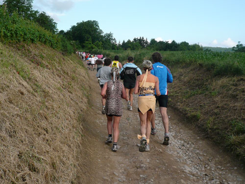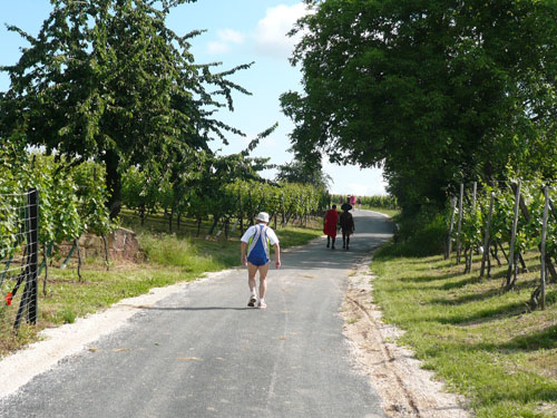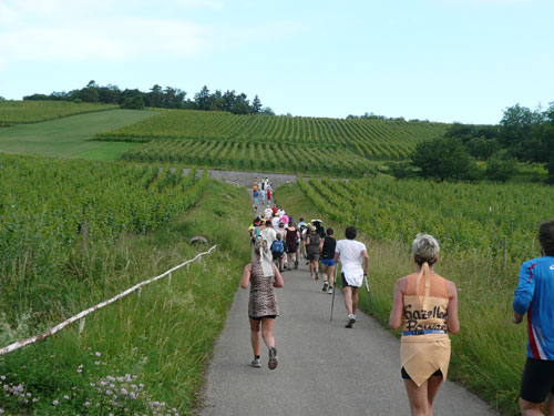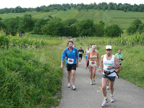 Direkt nach dem Ortschild von Ergersheim dürfen wir wieder an Höhe gewinnen. Unterwegs lese ich Jan auf, er hat noch einen vollen Magen vom Flammkuchenstand, darum muss er etwas langsamer machen. Ja, recht geschieht es ihm, weil er mir alles weggefuttert hat. Die nächsten 4 Kilometer durch die Weinberge beinhalten auch 50 Höhenmeter - auf zum Teil schwierigem Geläuf. Der längste Anstieg ist über einen Kilometer lang, die wenigsten haben aber heute Lust, den Weg hinauf zu laufen, wandern ist angesagt. Obwohl der Begriff Berg meines Erachtens etwas zu hoch gegriffen ist – ich würde eher sagen Hügel – beängstigend sind sie nicht. In Dahlenberg bei km 18 kann ich aber endlich meinen Hunger stillen, es gibt gegrillte Wurst. Ich bin anfangs skeptisch. Grillwurst während eines Marathons? Aber der Hunger überkommt mich und ich greife herzhaft zu. Ah, schmeckt richtig super, da geht’s mir gleich wieder viel besser. Zur Wurst wird Pinot Blanc serviert. Ich stille erst mal ausgiebig meine Bedürfnisse, bevor es weiter geht.