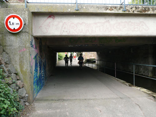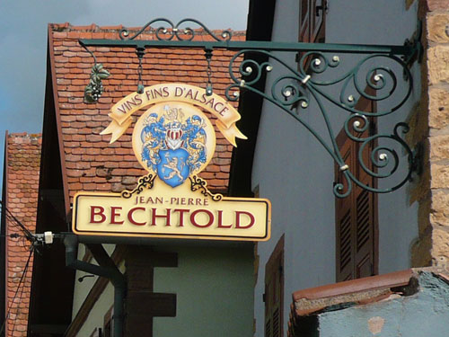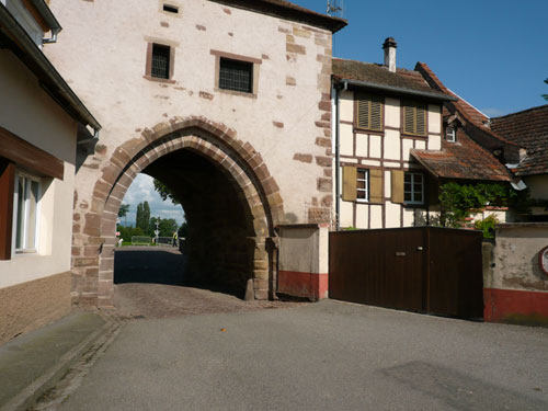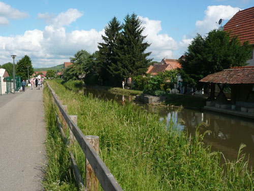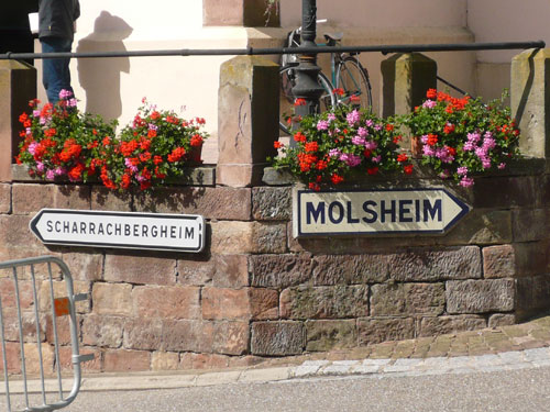 In einer Schleife führt uns der Weg nach Molsheim zurück. Nach km 8 gibt es für größer Gewachsene eine erste Bewährungsprobe zu überstehen. Es geht unter einer tiefen Betonbrücke durch, wer jetzt bereits zu tief ins Weinglas geschaut hat und vergisst den Kopf rechtzeitig einzuziehen wird sich eine Beule holen. Ich kann gerade noch realisieren, dass die Höhe für mich nicht reichen wird und komme unbeschadet durch. Der nächste Prüfstein folgt auf dem Fuß am Ortsende von Molsheim bei km 9,5. Ein grünstichiges, blass-gelbes Farbenspiel mit dem Namen Riesling. Seine ausgezeichnete Verträglichkeit mit zahlreichen Gerichten macht ihn zu einem viel gefragten Favoriten bei Feinschmeckern. Wir bekommen dazu Bretzeln serviert. Wieder haben sich viele eingefunden und können den Verlockungen nicht wiederstehen.