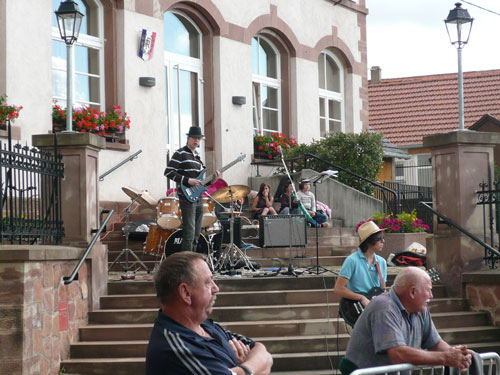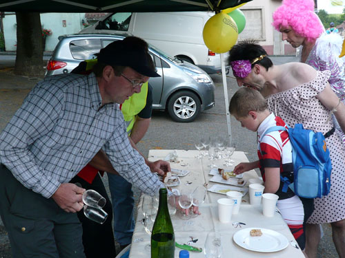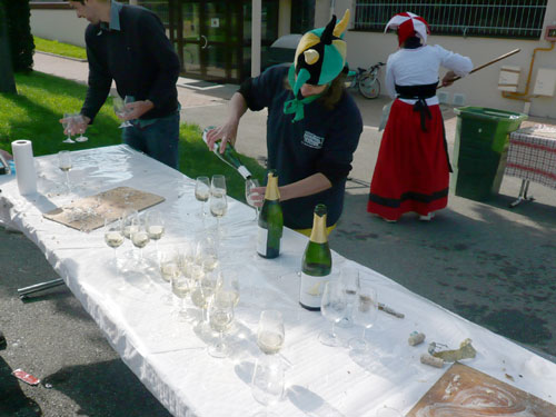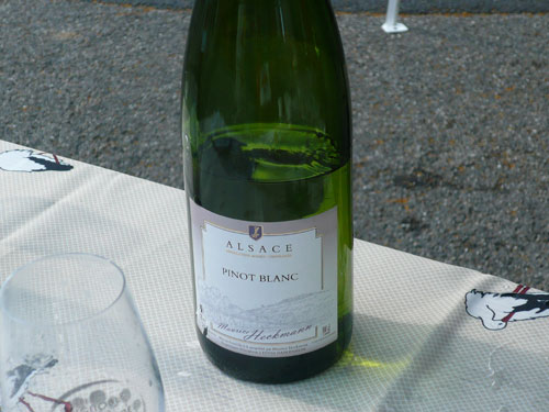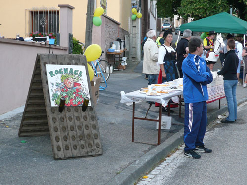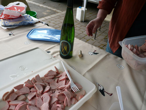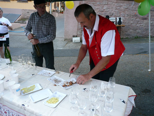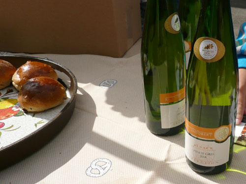 Pünktlich zum Startschuss des Halbmarathons treffen wir in Scharachbergheim ein, sie starten zweieinhalb Stunden nach den Marathonis. Das bedeutet, ich bin zeitmäßig genau im Soll. Gut, dass sie sich vom Acker machen, so ist mehr Platz am Weinstand. Zu Stollen mit Marmeladenfüllung wird ein 2008er Pinot Gris serviert, unverkennbar mit seinem ungewöhnlichen Aroma von Ingwer, Birnen und anderen Gewürzen. Man ordnet ihn den weißen Sorten zu, obwohl die Haut der Beeren rötlich bis rot gefärbt ist. Jedoch wird nur der reine Most der Pinot Gris-Trauben genutzt, so dass der Wein meistens eine kräftige goldgelbe Farbe erhält. Ich kenne ihn schon von gestern, ...exquisit.