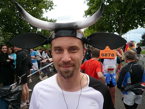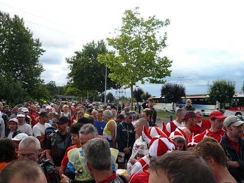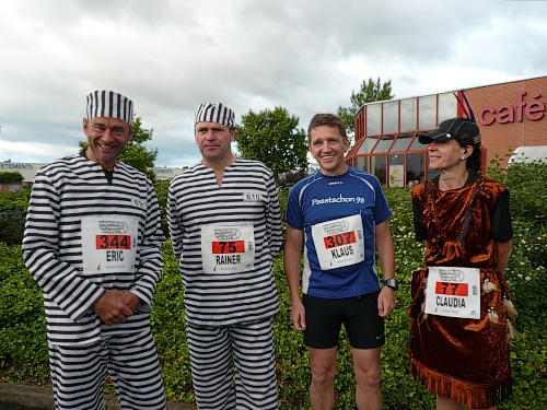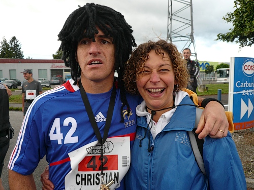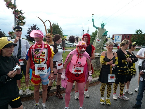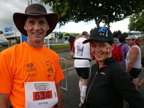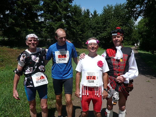 Magenkrämpfe und Lachkrämpfe als ich meine französischen Kumpels wiedersehe. Die sehen ja mal sowas von bescheuert aus! Das sind allesamt gestandene Ultratrail-Läufer, fantastische Sportler, knallharte Typen, die jetzt hier mit den skurrilsten Verkleidungen auftauchen. Ich will gerne lachen, aber die Blubbersuppe, die sich während der Bieler Nacht gebildet hat, erhöht das Risiko einer Fehlgeburt.
