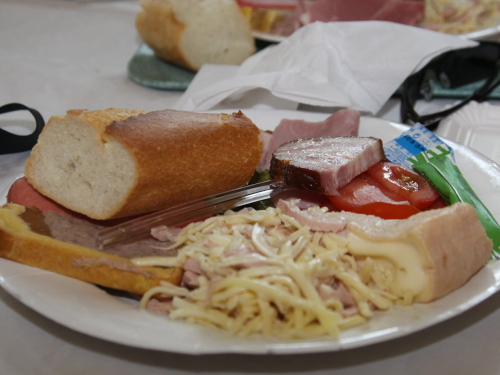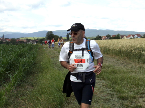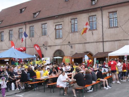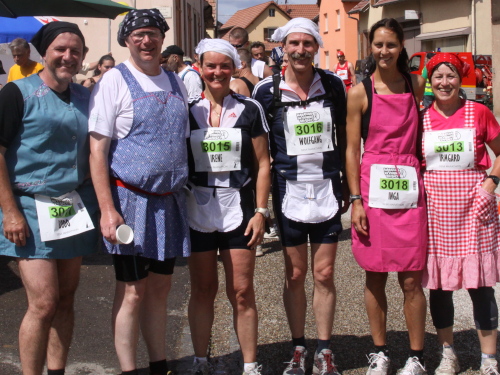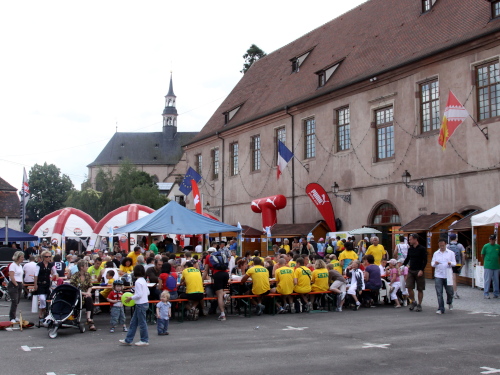 Kommen wir zum Preis. 28 Euro bezahlt, wer sich früh entscheidet. 42 Euro Spätentschlossene und 50 Euro Nachmelder. Zur aufgezählten Verpflegung am Vortag, unterwegs und im Ziel kommen noch eine Medaille, Urkunde, ein Trinkrucksack und ein T-Shirt. Wer rechnen kann, kommt schnell zu dem Ergebnis, dass das ja gar nicht geht. Hier schon, dem Sponsor Cora sei es gedankt. Cora ist eine große Supermarktkette, deren Spezialitäten-Theken legendär sind. Auf den Parkplätzen der Elsässischen Filialen stehen deshalb an manchen Tagen so viele Autos aus Deutschland wie aus Frankreich.