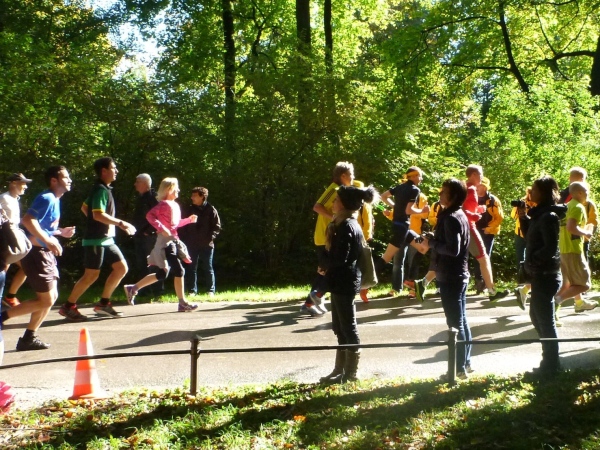 Auf der olympischen Marathonstrecke geht es Richtung Norden. Weil die Strecke recht eng ist, halte ich mich mit meinem Rad auf einem anderen Weg. Die Sonne strahlt nun hell. Die Blätter der Bäume leuchten in sämtlichen Herbsttönen. Und dazwischen die Läuferschar auf dem Weg zurück. Leider sieht man heute keine Schafherde. Die grast hier nämlich gelegentlich. Links in den Hochhäusern befindet sich die größte Studentenwohnanlage Deutschlands. Bei km 10,5 erreichen wir den Aumeister, ein netter Biergarten. Nebenan eine Verpflegungsstelle und der Hinweis, dass „nur noch“ 31,5 Kilometer zu bewältigen sind.