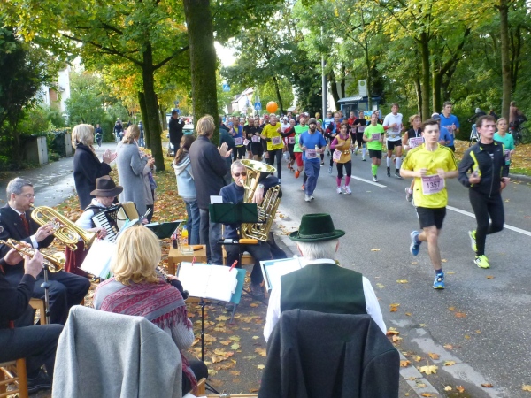 Über die Oberföhringer Straße geht es stadtauswärts, immer an der Isarhangkante entlang. Beim Queren des Mittleren Rings kann man die Hochhäuser des Arabellaparks sehen und das schicke Hypo-Haus. Zwei komplette Familien unterhalten hier schon zum dritten Mal in Folge die Läufer mit Blasmusik und versorgen sie mit Getränken. Ich sage das ausdrücklich, um zu zeigen, dass beim München Marathon einige Anlieger beim Marathon mitmachen, statt dagegen zu sein. Nächste Überraschung: Eine Mutter mit zwei Kindern fütter die Läuferinnen und Läufern mit Bananen. Na bitte, es geht doch.